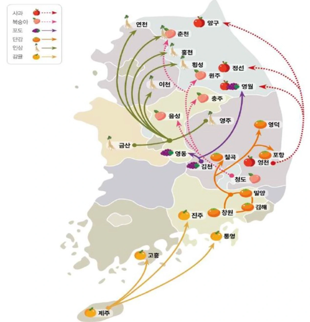 1970~2015년 통게청 농림어업총조사 분석 결과 사과, 복숭아, 포도 등의 주산지가 기온 상승으로 인해 북상한 것으로 나타났다.