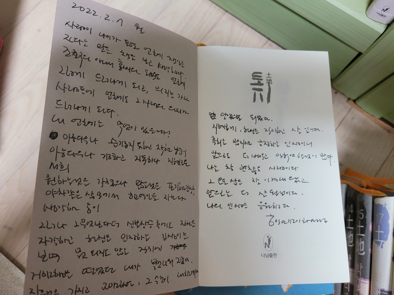 그것이 나와 토지와의 만남이었다. 그래서 그런지 토지를 읽었던 시점을 반추해보면 늘 어둡고 쓸쓸했다. 물론 모든 인생이 그리 밝지는 않지만, 그 책은 내가 힘들거나 외로울 때 나의 동무가 되어주었다. 책을 읽고 독후감을 책 뒤편에 쓰는 습관을 가진 덕분에 토지 전 권(21권)에 나의 감정은 생생히 살아있었다. 그래서 나는 토지를 읽을 때마다 생각하곤 한다. 그 어려운 길을 잘 이겨내서 기특하다고, 나는 토지를 읽으며 나와 다른 여러 등장인물을 보며 위안을 얻고, 삶의 길을 찾았는지 모른다.