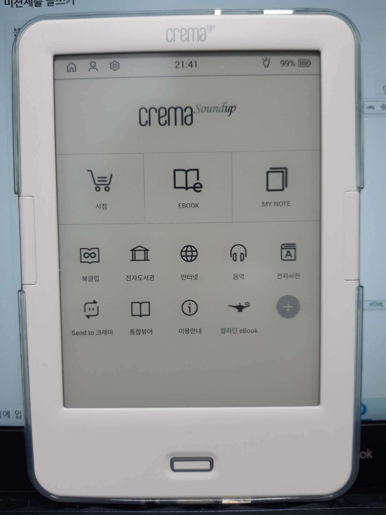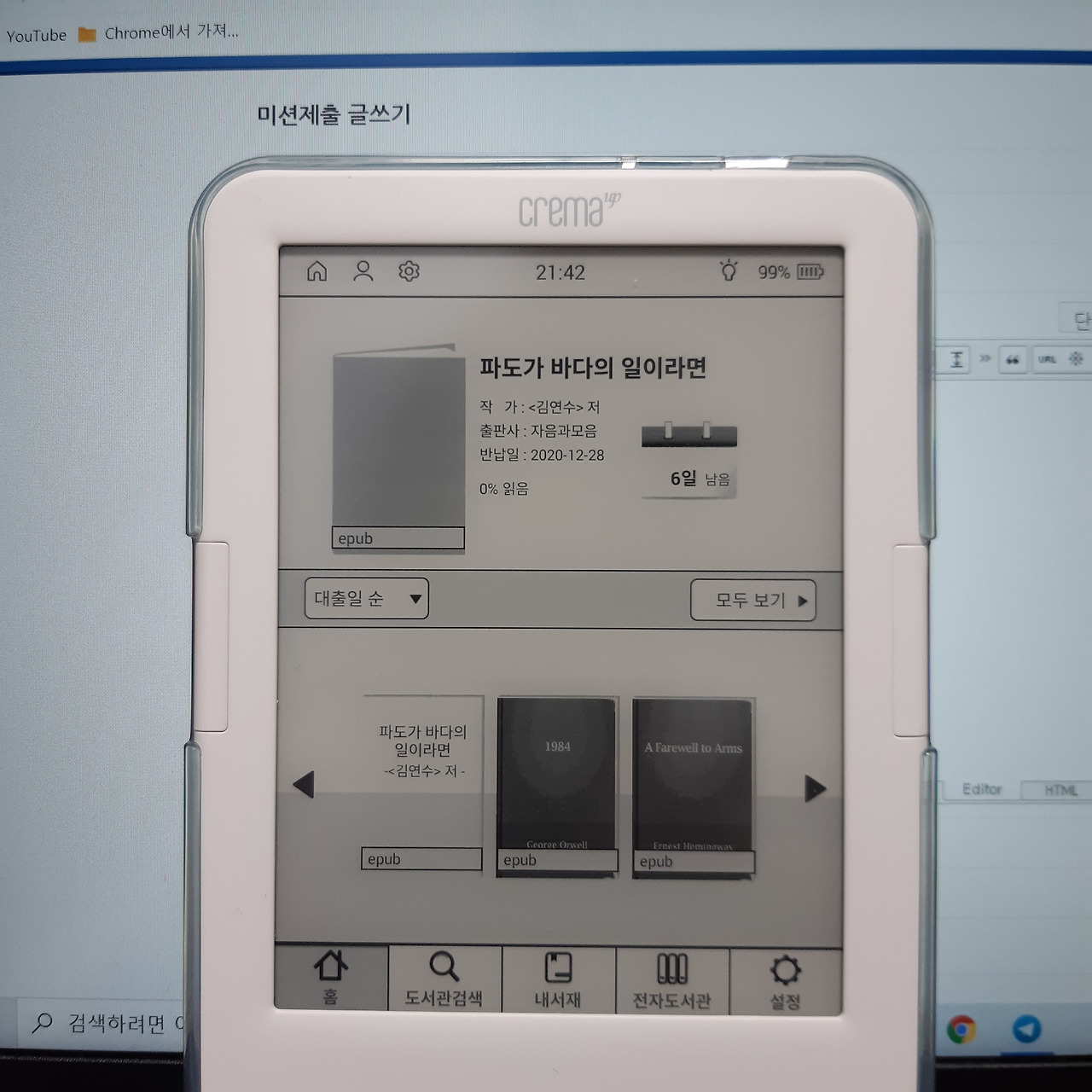 원래 종이책의 질감을 좋아해 가지고 있으면서도 제대로 써본 적은 없던 크레마였다. (심지어 내 것도 아닌 가족 구성원의 것인데 내 방에 있다) 종이책처럼 잉크로 화면이 표시되는 형식이 나름 신선했으나, 그만큼 기계임에도 반응 속도가 느려 내 마음에는 들지 않았던 것이다. 그런데 사람은 역시 변한댔나. 갑자기 크레마에 애정이 생겼다. 정확히는, 출퇴근 시간에 책을 다시 읽어야겠다고 마음먹은 뒤부터 크레마를 애용하기로 했다.