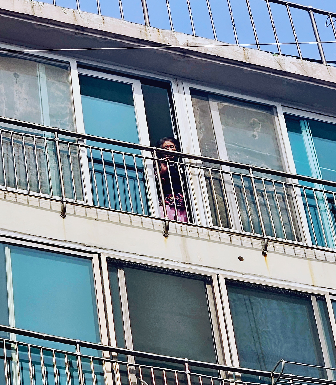 베란다 창문으로 얼굴만 빼꼼 내밀고는