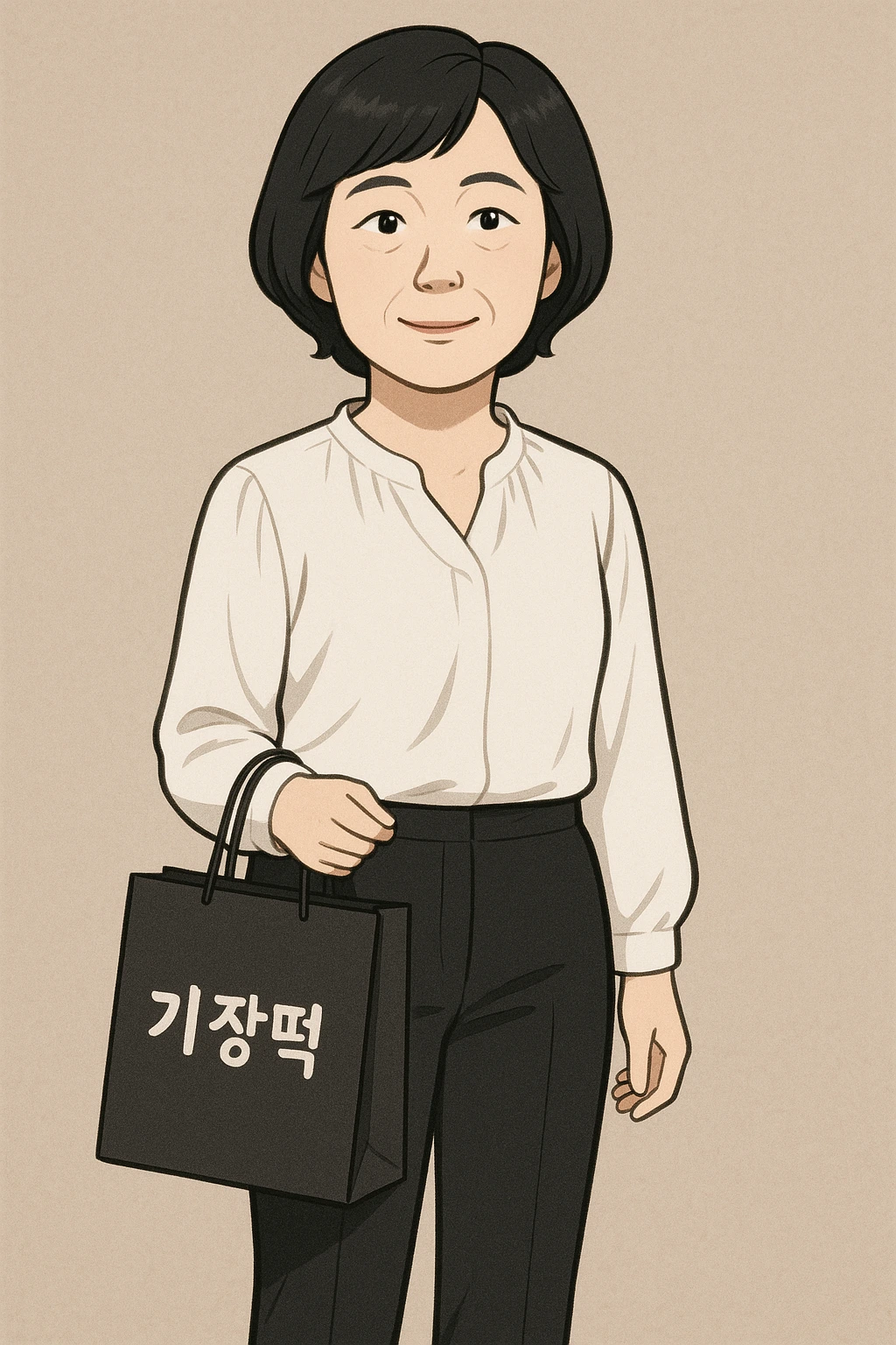 문제는 그 가방들이 엄마의 옷차림과 전혀 어울리지 않는다는 점이다. 군더더기 없이 깔끔한 슬랙스에 하늘하늘 블라우스를 입고, 마무리로 가방을 드는데… 어딘가 2% 부족해 보이는 이유는 '기장떡'이라 적힌 종이가방 때문이었다.