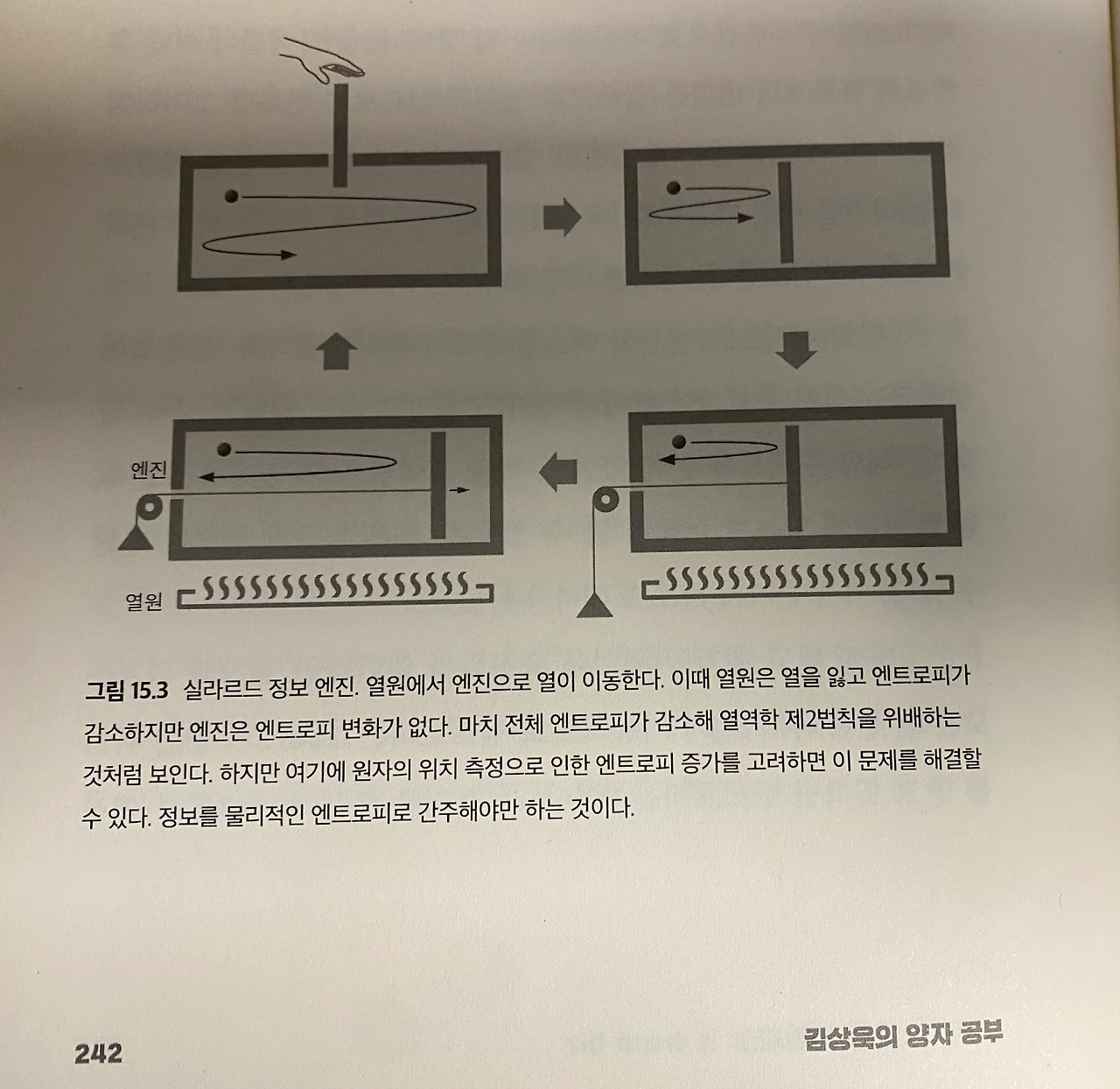 정보가 일로 바뀌는 과정은 헝가리 태생의 미국 물리학자 실라르드 레오의 사고 실험인 실라르드 엔진과 함께 설명된다. 다음 그림으로 책에 실린 실라르드 엔진의 그림이다(책에 더 자세한 설명이 실려있다).
