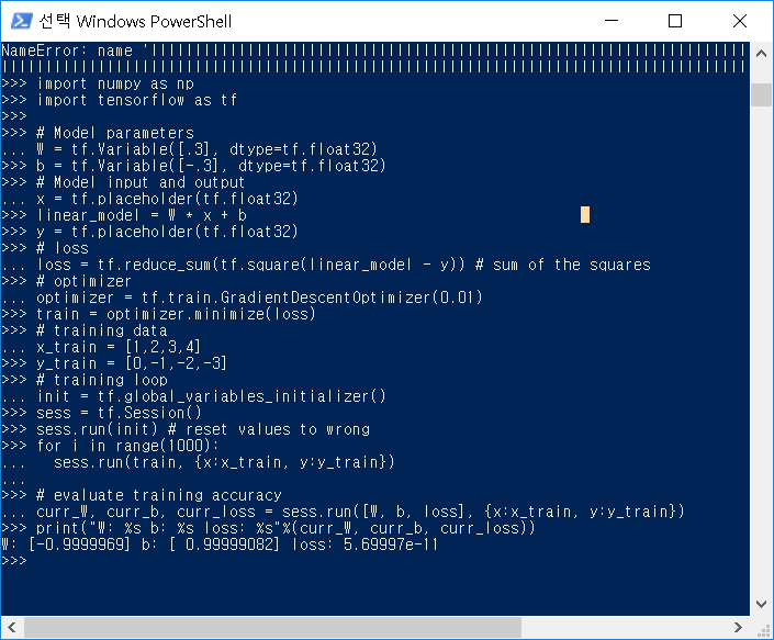 loss가 매우 작은 것에 주목하자. 0에 가깝다. 모델이 랜덤 값으로 초기화되기 때문에 실제 각자 환경에서 실행해본 결과는 정확하게 같진 않을 수 있다.