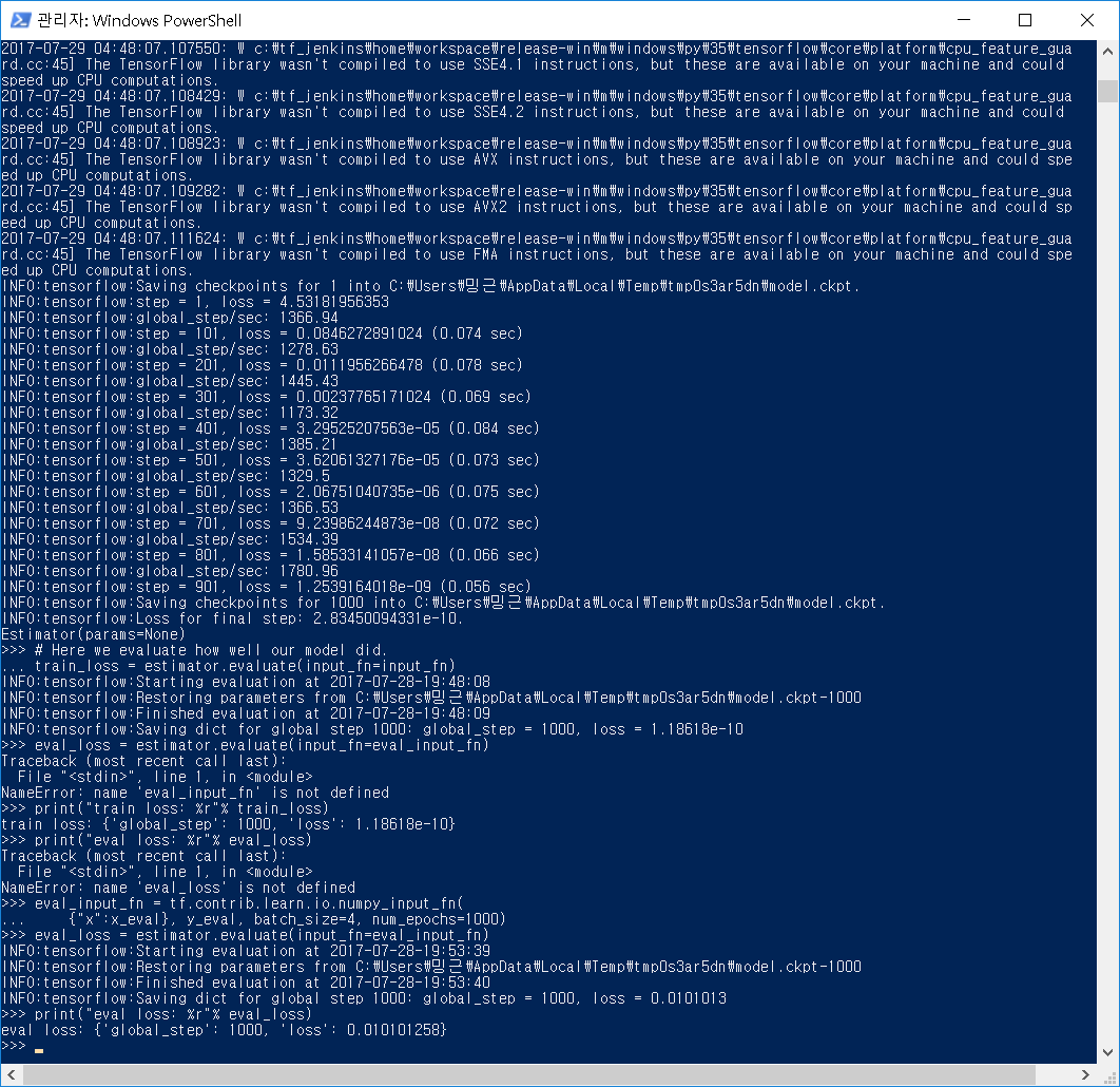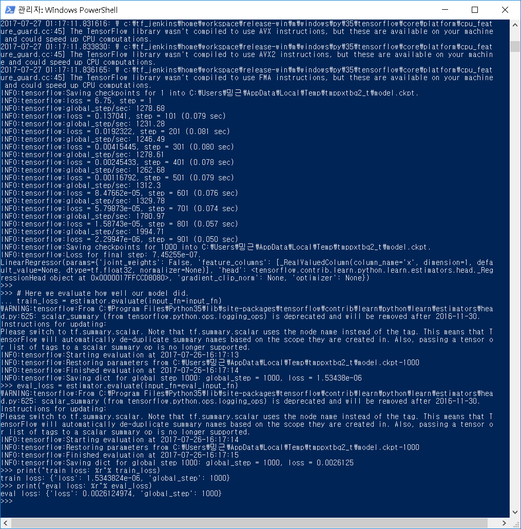 참고로 위 코드는 그 위의 tf.contrib.learn 코드에서 사용됐던 아래 두 라인 없이 실행하면 에러 난다.