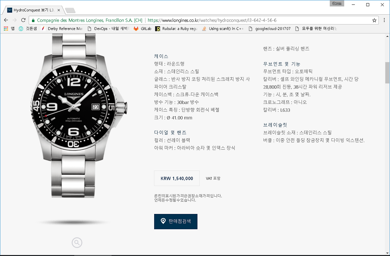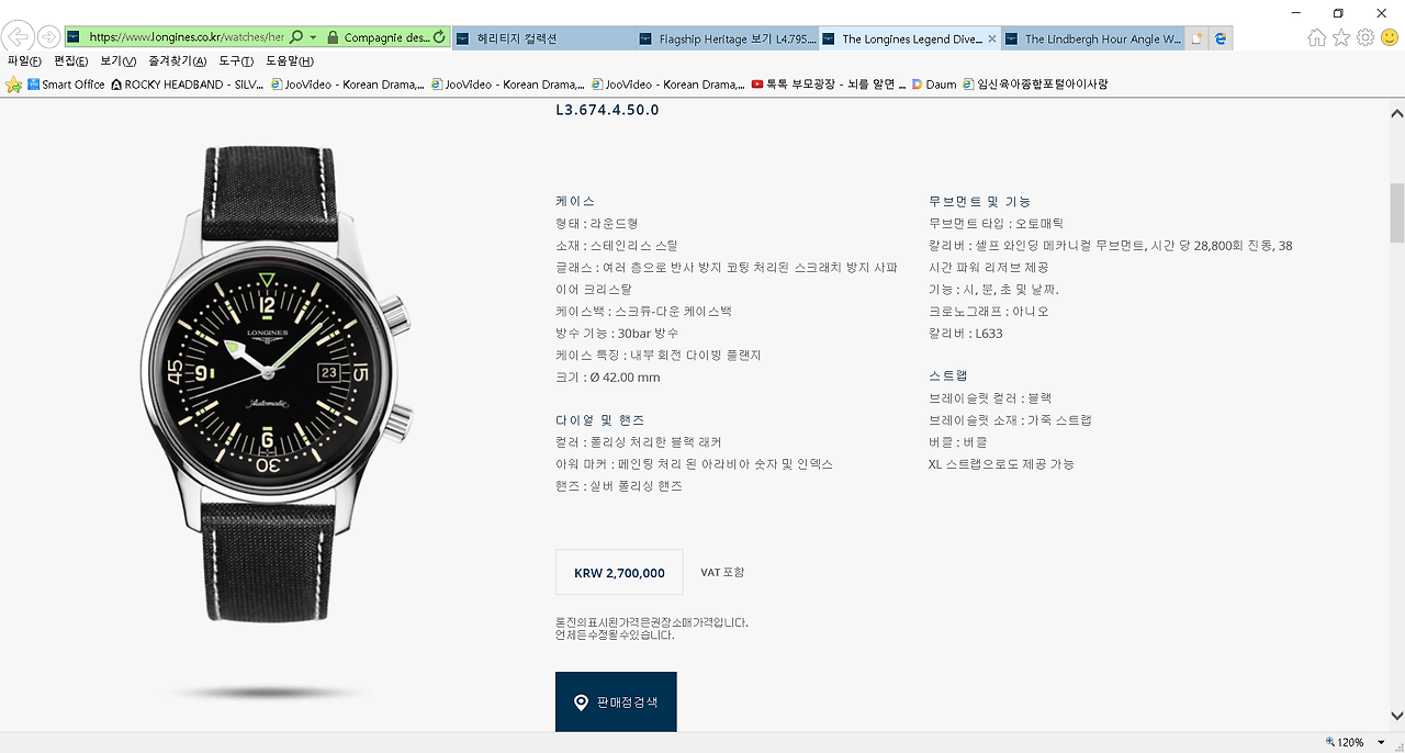 다이얼 크기 자체는 42mm로 좋은데, 러그 투 러그가 굉장히 길어서 실제론 손목이 좀 두꺼워야 어울린다는 평이 있다. 나중에 실착 해봐야겠다. 가격은 270만 원