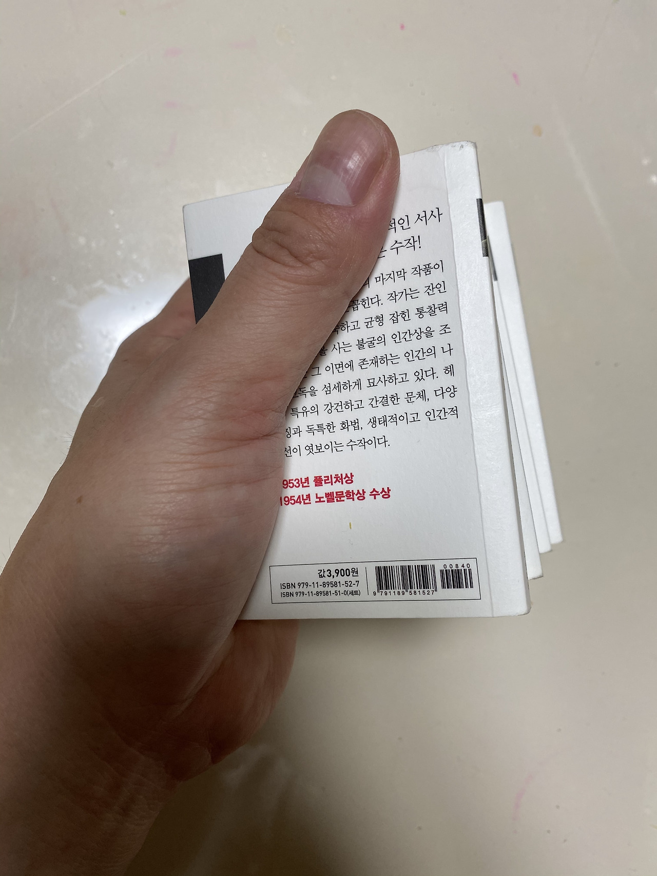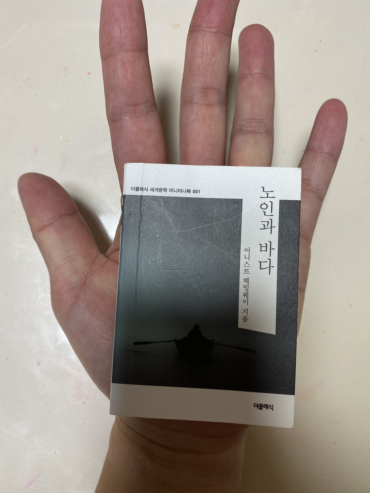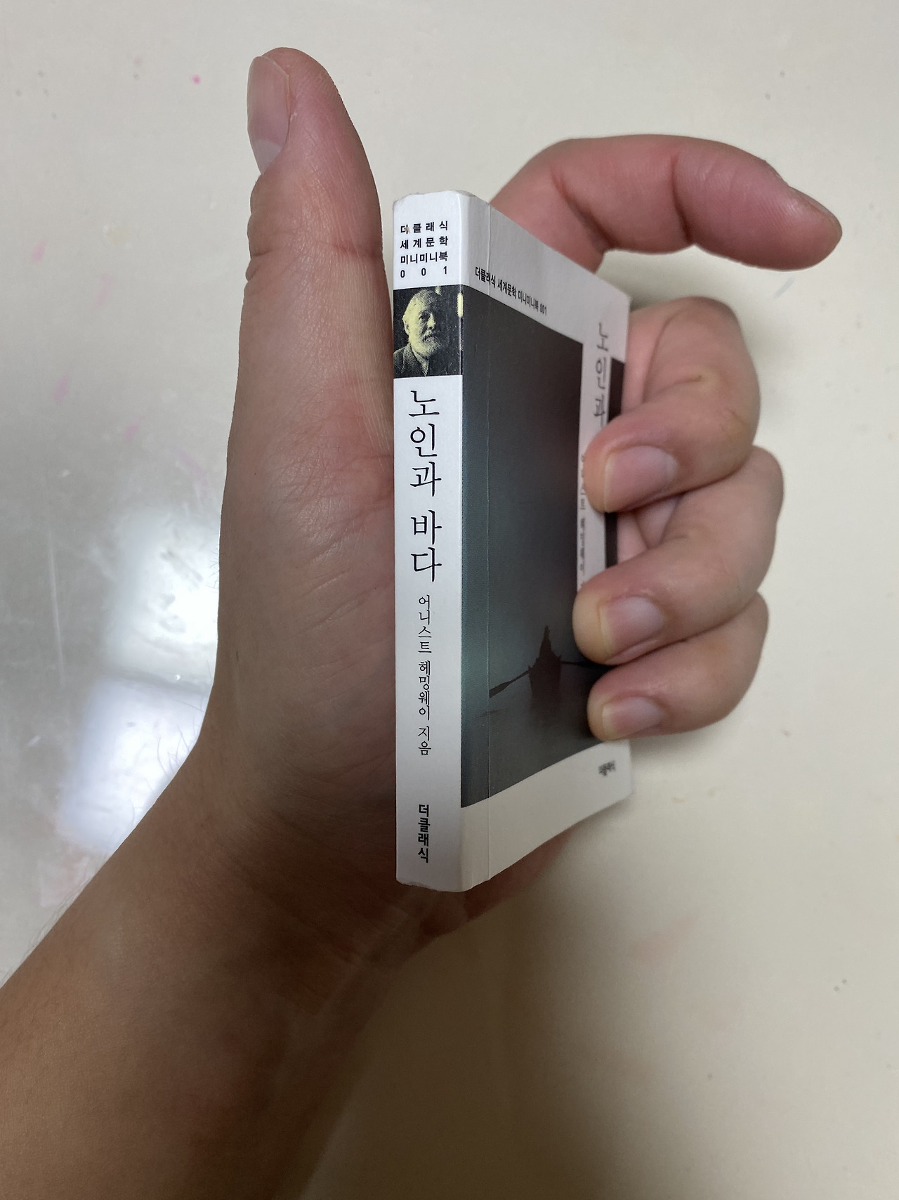 그 앞에 서서 잠시 고민했다. 이걸 살까 말까. 하나 들어서 펼쳐보니 종이의 질감은 나쁘지 않았다. 더 클래식이란 출판사는 처음 들어보는 출판사였지만(사실 내가 아는 출판사 자체가 많지 않다. 기껏해야 민음사, 열린 책들, 펭귄클래식 정도), 크기에 비해 만듦새가 나쁘지 않아 보였다. 그래서 마치 예전에 아주 작은 크기의 해적판으로 출시된 일본 불법 만화책을 들여다보는 기분으로 그 자리에서 조금 읽어보았다. 그런데 번역 품질도 괜찮았다. 사도 괜찮겠는데? 사실 생각해 보면 e북 리더기를 들고 다닌다고 해서 출퇴근 길에 여러 권의 책을 번갈아 읽지도 않았다. 그럼 그보다 가볍고 작아서 심지어 청바지 주머니에도 들어가는 이 책을 안 살 이유가 없잖아? 그렇게 그 자리에서 노인과 바다를 충동구매했다. 가격도 4천 원이 채 되지 않아서 아무 부담이 없었다. 노인과 바다를 고른 이유는 뭐 대단한 게 있는 건 아니었고 그냥 그날따라 제일 끌려서였다.