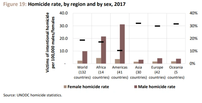 (전 세계적으로, 살인 희생자의 81%는 남성이고, 전 세계 남성 살인율(10만 명당 9.1명)은 여성 전 세계 살인율(2.0명)의 약 4배이다. 가장 높은 남성 살인율은 아메리카와 아프리카에서 관찰될 수 있고(남자 10만 명당 각각 31.2명, 21.5명), 아시아(3.1명), 유럽(4.3명), 오세아니아(3.9명)에서 관찰될 수 있다. 이와는 대조적으로, 여성 살인율은 아프리카에서 10만 명당 4.5명, 아시아에서는 1.5명이라는 좁은 범위에 머물러 있다. 이에 따라 남성 사망률과 여성 살인율의 비율은 2.0~4.8로 남성 사망률이 여성 사망률의 8배를 넘는 아메리카를 제외한 모든 지역에서 차이가 난다.)