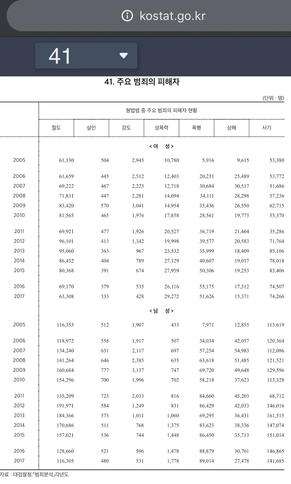 39번째 시트부터 43번 시트까지가 ‘사회안전’에 대한 자료다. 그리고 내가 원하던 자료는 41번 ‘주요 범죄의 피해자’ 시트에 있었다. 대검찰청에서 제공한 자료로 형범법 중 주요 범죄의 피해자 현황(2006년~2017년)이 나와있는 자료다. 대검찰청에선 주요 범죄를 절도, 살인, 강도, 성폭력, 폭행, 상해, 사기로 나누고 있었다.
