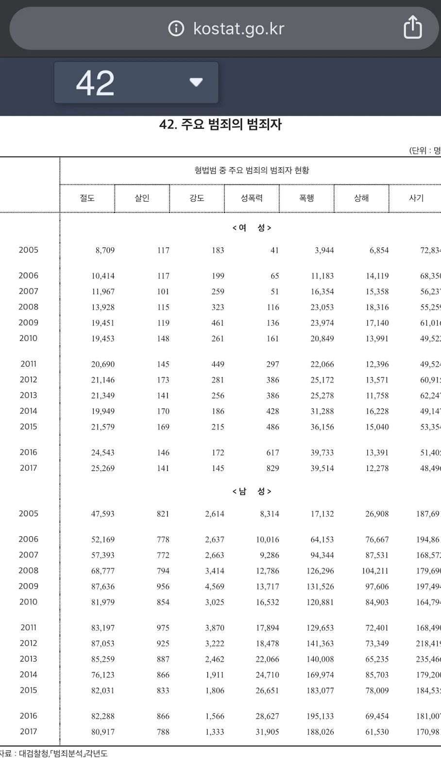외국만 그럴까? 아니다. 다시 우리나라 통계청 자료로 돌아와 보자. 42번 시트의 제목은 ‘주요 범죄의 범죄자’이다. 역시 대검찰청에서 제공한 자료로 동일한 기준으로 이번엔 주요 범죄의 범죄자 현황을 표로 보여주고 있다. 그리고 설명할 필요도 없이 모든 범죄 유형에서 남성 범죄자의 숫자가 압도적으로 높다. 정말 압도적이다. 여성 범죄자의 숫자는 비교라는 말을 붙이기 민망할 정도로 적다.
