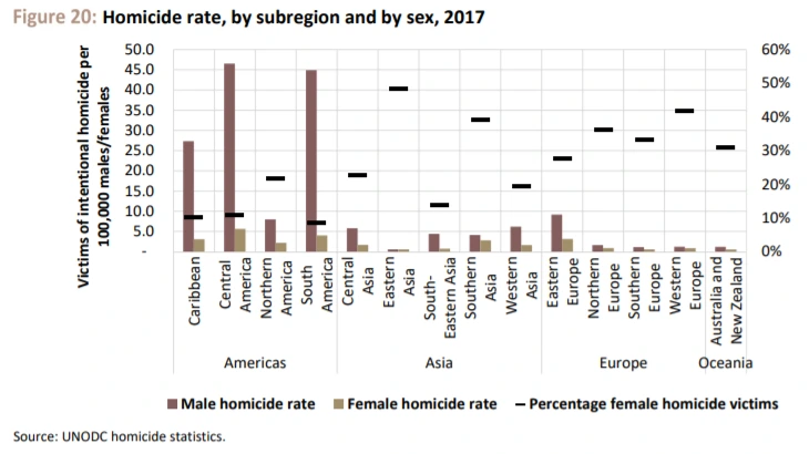 (전 세계 132개국을 대상으로 한 데이터를 분석한 결과 거의 모든 국가와 하위 지역에서 남성 살인율이 여성 살인율보다 상당히 높은 것으로 나타났다. 남아메리카, 중앙아메리카, 카리브해에서 남녀 살인율의 가장 큰 차이는 남성 살인율이 여성 살인율의 8배에서 11배나 되는 것으로 나타났다. 중앙아시아, 남동아시아, 서아시아, 동유럽(그림 20)에도 큰 차이가 존재한다.)
