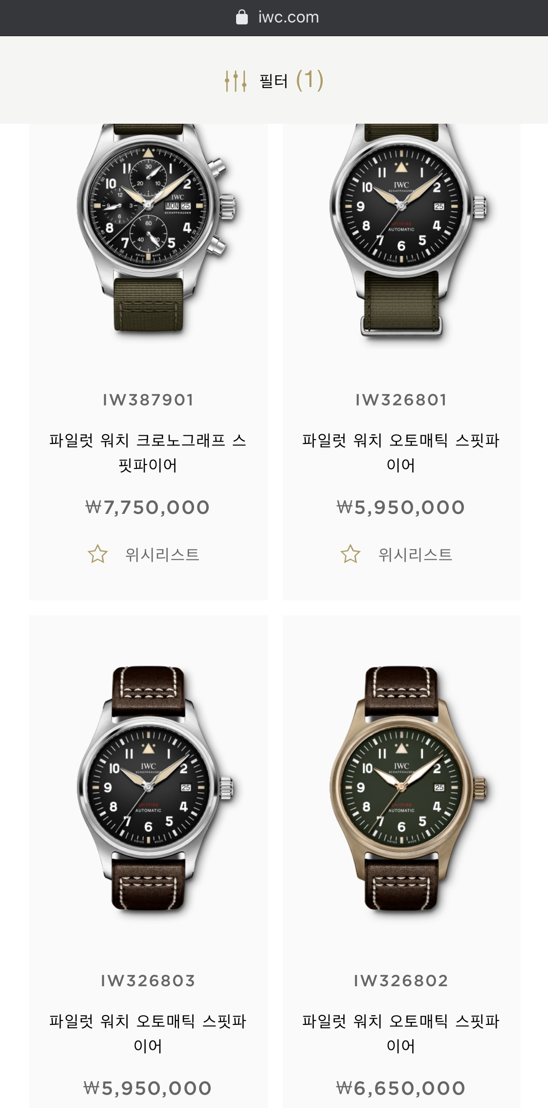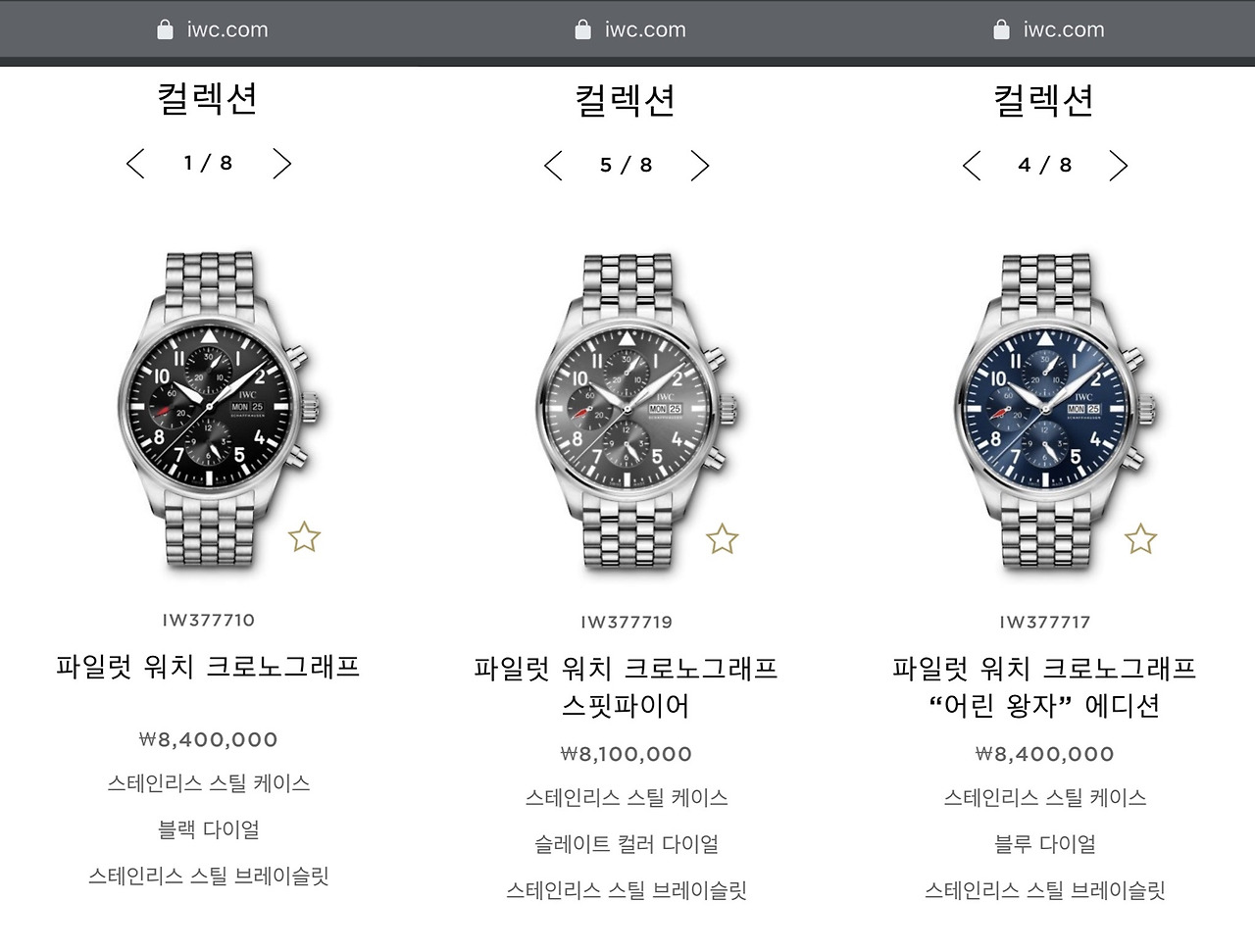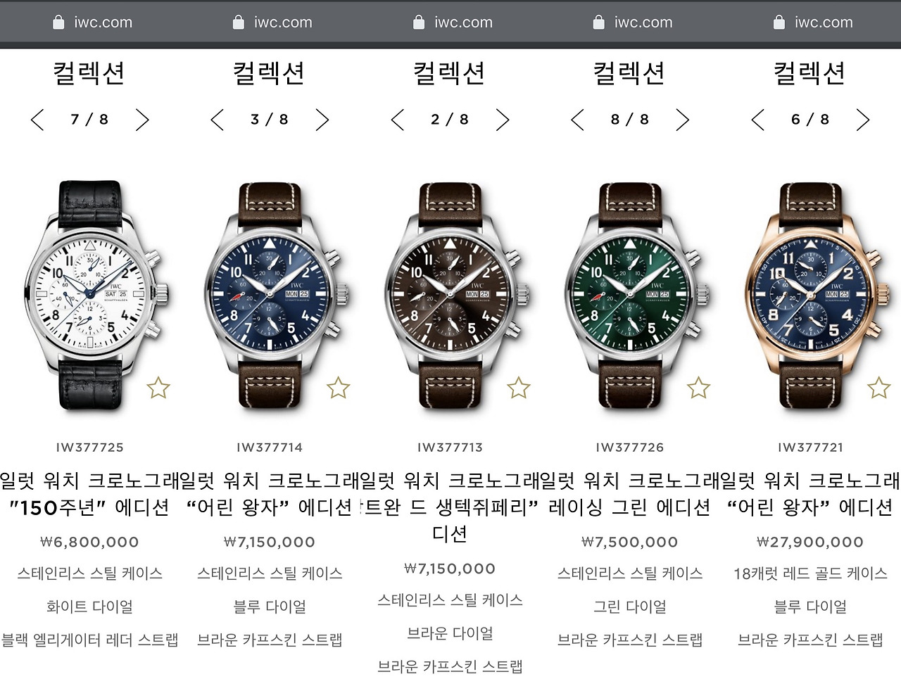 IWC 홈페이지에 들어가면 여러 형제 모델도 볼 수 있다. 물론 가장 기본인 검은 다이얼이 제일 멋지지만, 흰색이나 파란색 다이얼도 멋져 보이긴 한다. 다만 갈색이나 녹색 다이얼은 아직 조금 낯설다. 마지막 레드 골드 케이스에 파란색 다이얼은 색 조합이 멋지긴 한데 가격이 멋지지 않다.