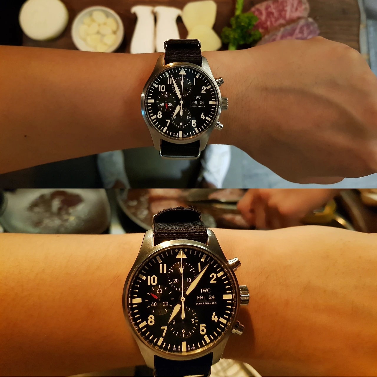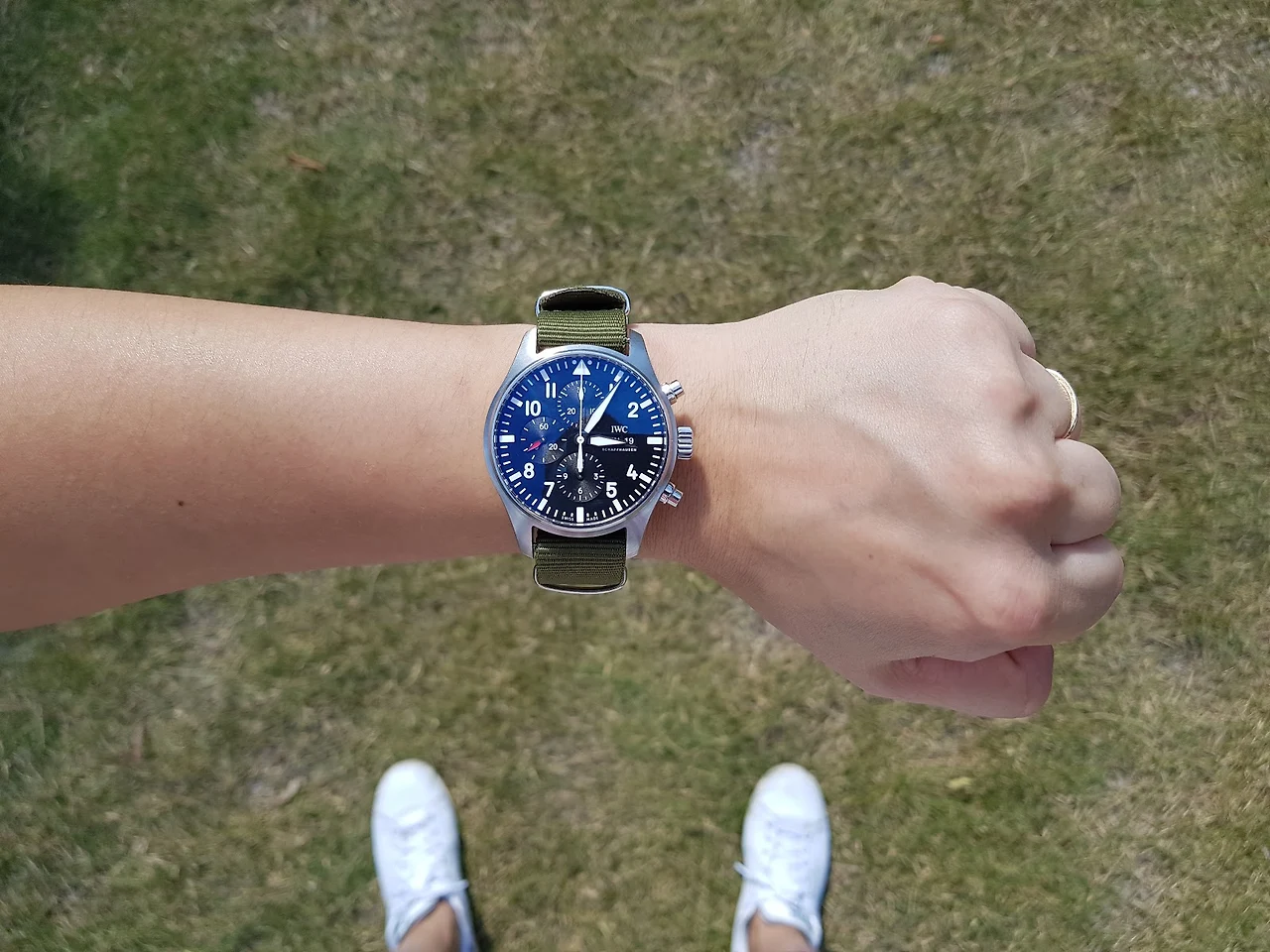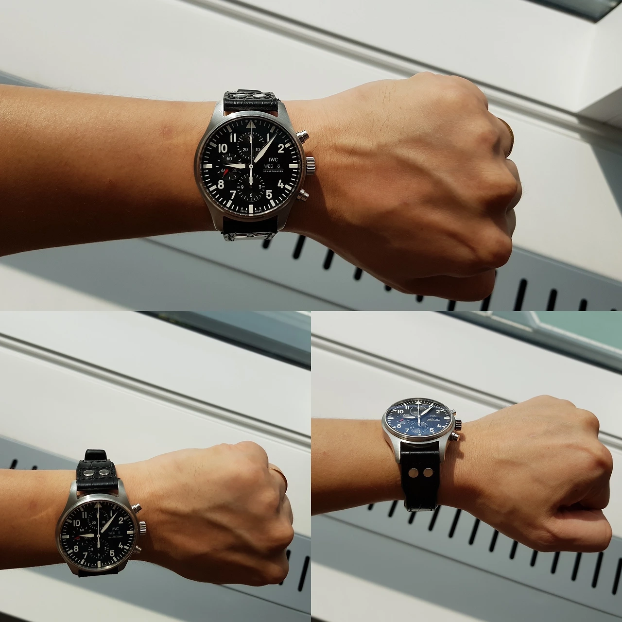 파일럿 시계답게 리벳 박힌 스트랩이 썩 잘 어울렸다. 다만, 지금 사진에 보이는 스트랩은 진짜 악어가죽이 아니라 악어가죽 모양을 낸 소가죽 스트랩이다. 독일의 리오스란 시계줄 회사에서 만든 스트랩인데 겉모습은 멋있었지만 착용감은 좋진 않았다. 뻣뻣한 느낌이 한참을 차고 다녀도 쉽사리 없어지지 않아서 그래서 이 스트랩보단 착용감이 훨씬 좋은 녹색이나 검정 나토 스트랩으로 차고 다녔다.