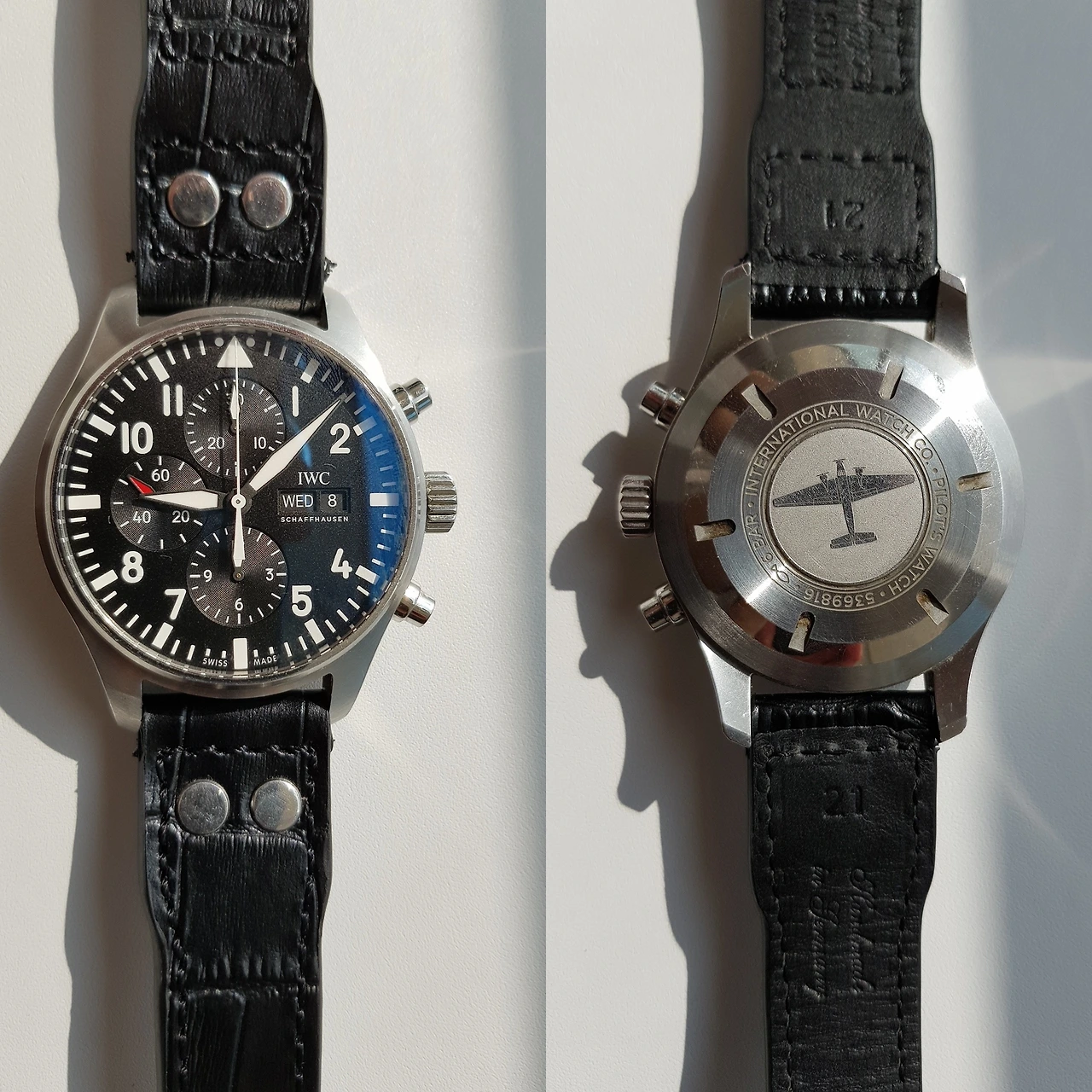 뒷면에는 모든 빅 파일럿 워치 디자인에 영감을 주었다는 Junkers JU-52 비행기가 인그레이빙되어 있다. 사실 비행기에 큰 관심이 없어서 이 비행기가 얼마나 유명한 비행기인지 잘 모르겠지만, 파일럿 시계 뒤에 비행기를 인그레이빙한 건 아주 훌륭한 디자인 콘셉트라고 생각한다.