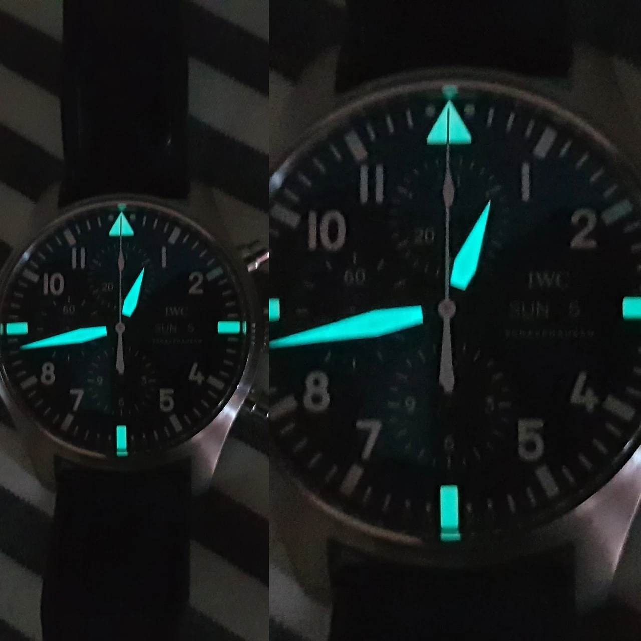 시계의 야광 성능은 기대에 조금 못 미쳤다. 발린 도료의 성능 자체는 사진에 보이는 것처럼 괜찮았는데 모든 인덱스에 야광 도료가 발려있을 게 아니라 12시, 3시, 6시, 9시 방향과 시침, 분침에만 발려 있었다. 게다가 이전 시계가 워낙에 뛰어난 야광 성능으로 유명한 파네라이였던 탓에 더욱 아쉬웠다.