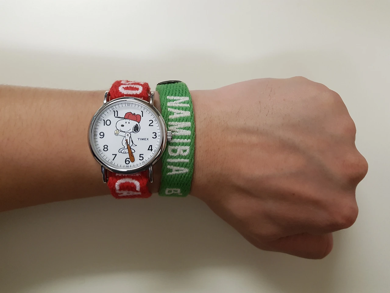 삼청동에서 샀던 팔찌를 시계줄 대용으로 사용해 보기도 했다. 스누피 모자가 빨간색이어서 빨간색 줄이 아주 잘 어울렸다.