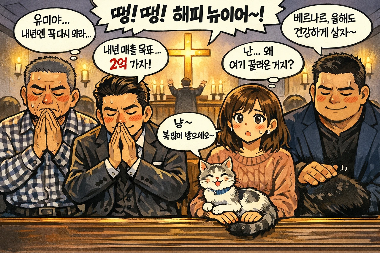 교회 안으로 들어서자 따뜻한 온기가 우리를 감쌌다. 태풍 사장은 익숙한 듯 맨 앞줄에 자리를 잡았다. 평소 돈 냄새라면 귀신같이 맡던 그 눈빛이, 십자가를 향해 경건하게 빛나고 있었다. 하지만 자리에 앉자마자 그가 내 귓가에 속삭인 말은 내 기대를 저버리지 않았다.