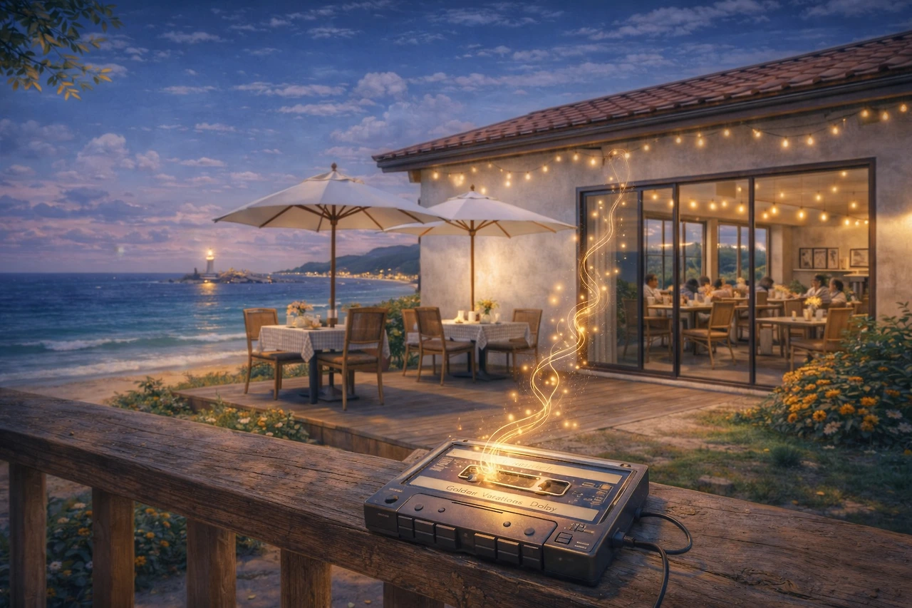 오후 5시. 태풍 사장은 식당의 조명을 가장 아늑한 조도로 맞추고 테이블 위의 리넨을 정리했다. 그는 노신사가 미리 보내온 낡은 카세트테이프 하나를 조심스럽게 만졌다. 70년대 어디쯤에서 시간이 멈춘 듯한, 라벨이 다 해진 테이프. 그 안에는 노신사의 삶이 녹아 있는 선율이 담겨 있을 것이다.