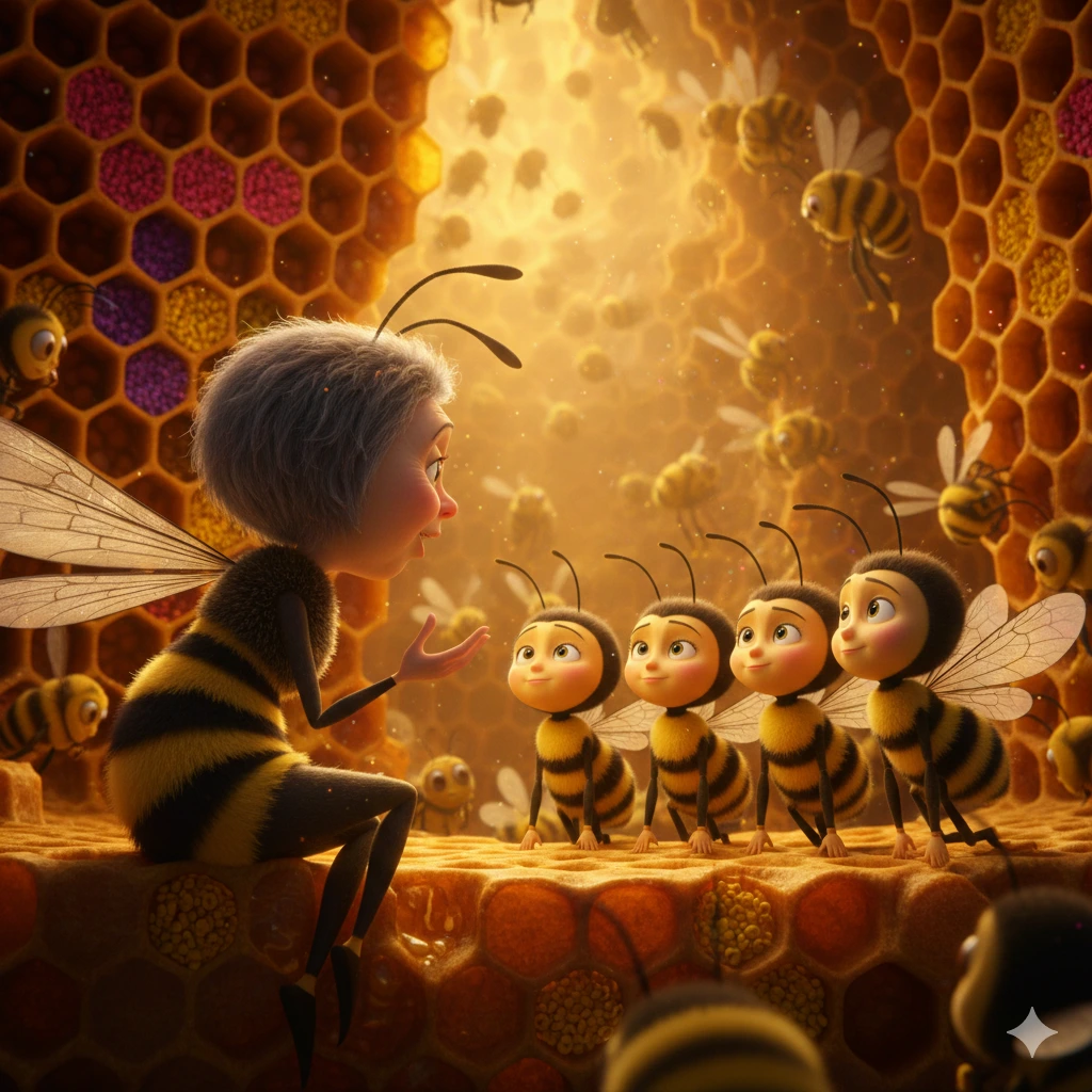“얘들아, 우리 벌집의 모든 생명은 이 물 한 방울에 달려 있단다. 너희가 아는 달콤한 꿀도 사실은 물이 없으면 아무 소용이 없어. 꽃에서 가져온 꿀은 너무 끈적해서 어린 애벌레들이 먹기 힘들거든. 이 물로 묽혀야 영양 가득한 먹이가 되지.”