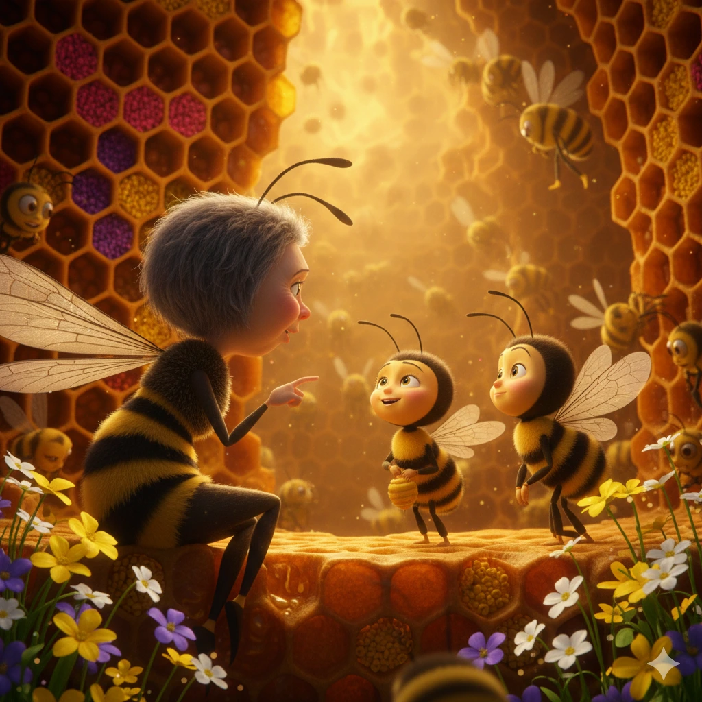 알리다 선생님이 벌집 입구에서 조아와 친구들을 바라보며 말했다. 그녀의 겹눈은 따뜻했지만, 목소리에는 단단한 가르침이 실려 있었다.