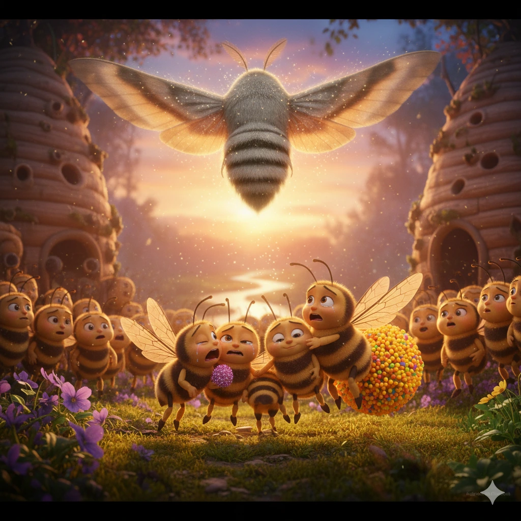 "조아, 오늘 고생 많았다. 네가 가져온 이 노란 꽃가루는 우리 벌집의 가장 소중한 보물이 될 거야. 그리고… 숲에 멋진 친구를 사귄 걸 진심으로 축하한다."