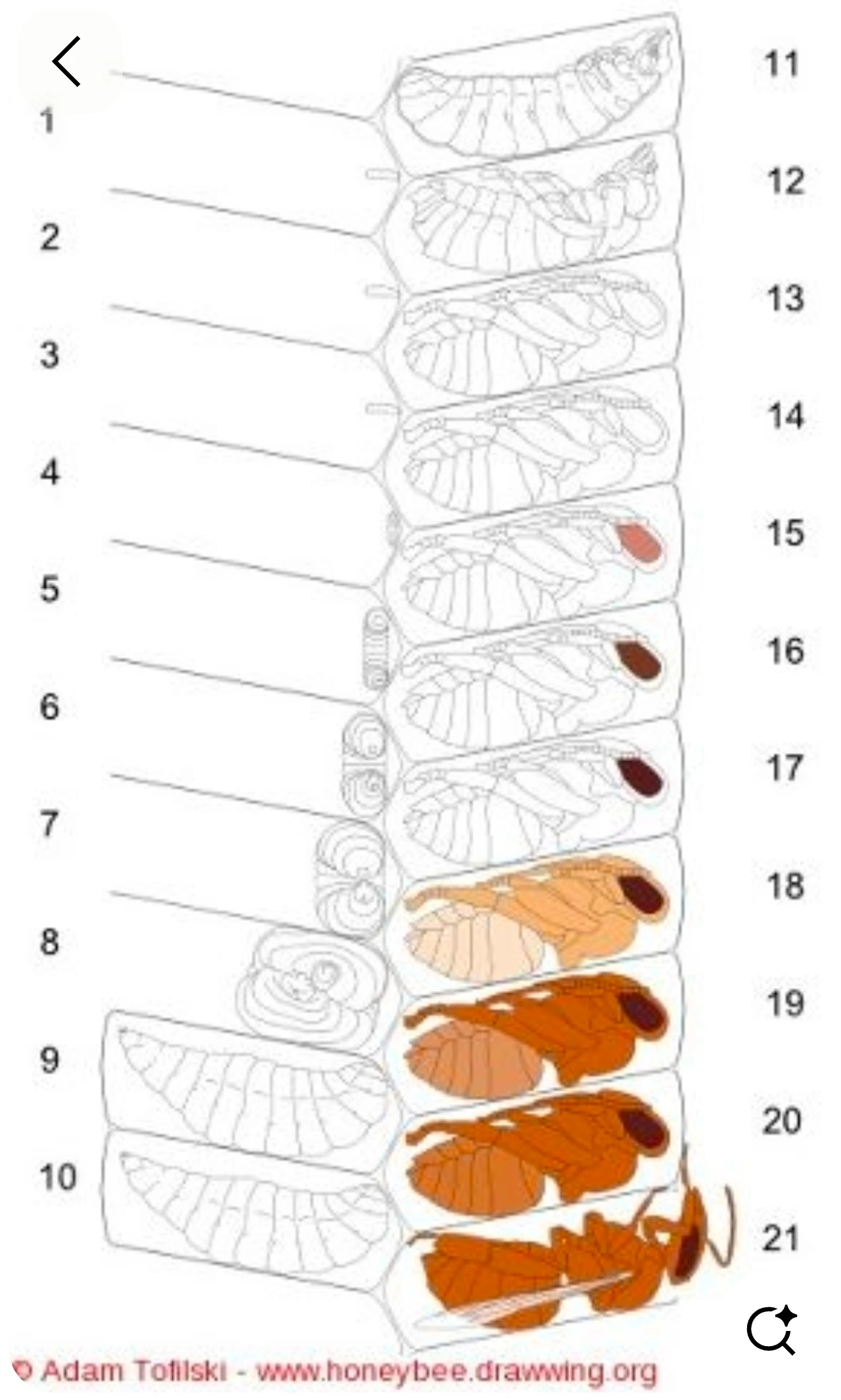 * 일벌(조아) 탄생주기 1일 차(알)에서 21일 차(성충)까지