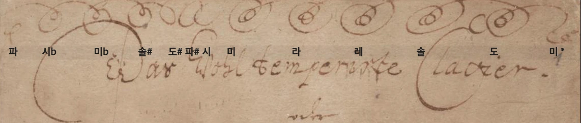 흥미로운 점은 제목 “Das Wohltemperirte Clavier” 가운데, ‘D’ 아래에 조그맣게 적힌 ‘Es’이다. 독일어로 Es는 영어로 Eb을 뜻 하는데 이는 레♯/미♭이라는 음이 조율에서 매우 중요한 전환점임을 암시한다. 이 음 주변은 전통적으로 불협이 가장 잘 느껴지는 곳이기 때문에, 조율의 균형을 잡으려면 이곳에 "좁은 5도(–1/4 syntonic comma)"를 배치하는 것이 필요하다.