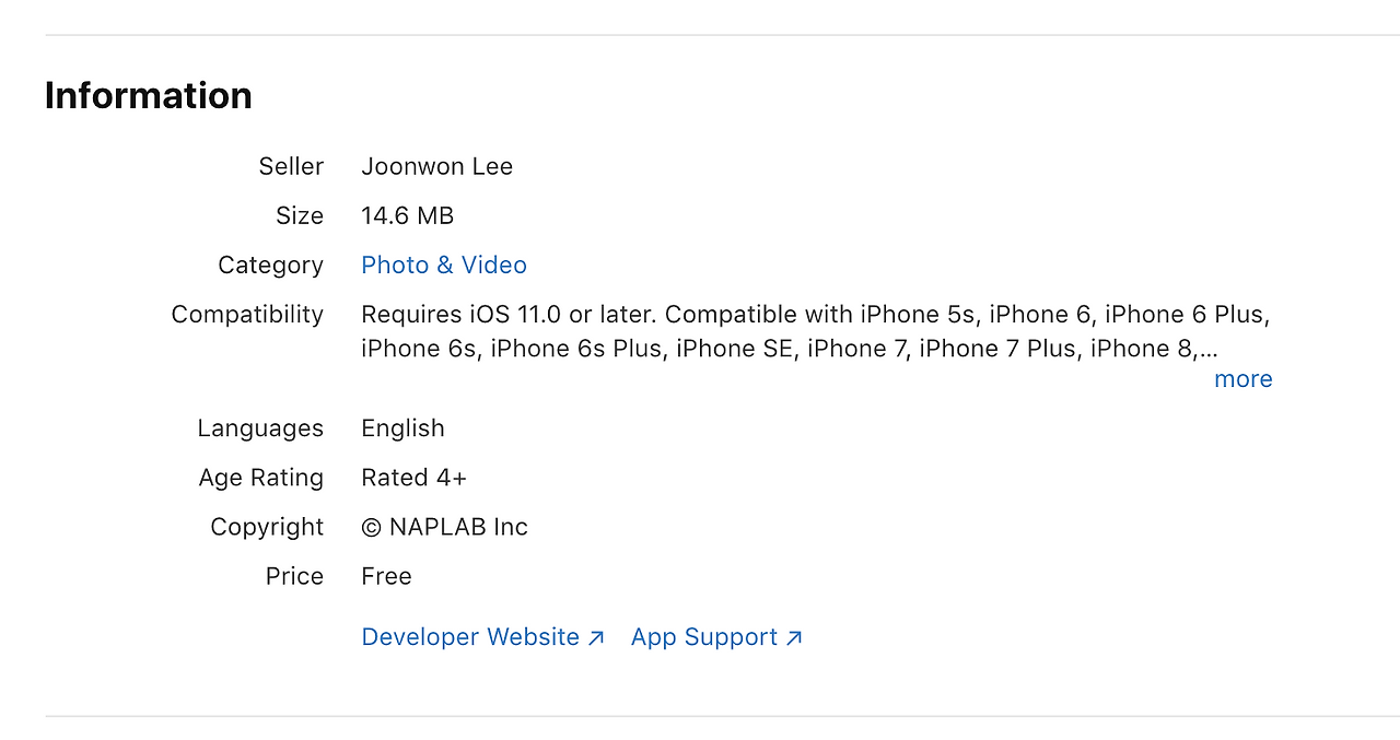 앱을 등록할 때 필요한 앱 정보 몇 가지가 있다. 설명, 키워드, 스크린샷, 아이콘 등 눈에 띄는 값들 외에도 잘 보지는 않지만 Information 잴 하단에 노출하는 Developer Website, App Support 링크 같은 것들,,, 한국어로는 정보 세션의 개발자 사이트와 앱 지원으로 보인다.