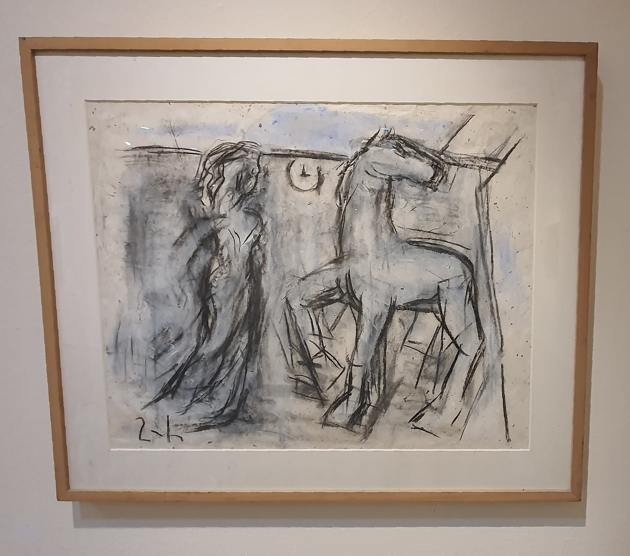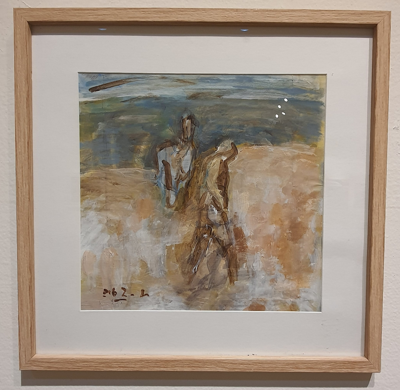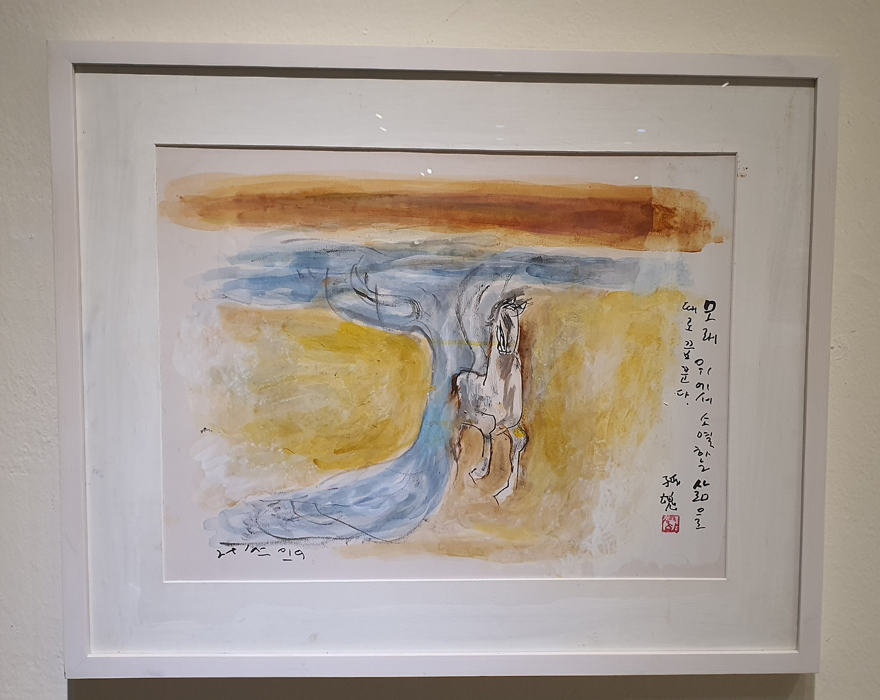 그동안 말이 등장하는 공간은 모두 건물의 내부였다. 문 밖에 있기도 했지만 문의 바깥일뿐 실내의 공간이 주가 되는 구도였기에 벽이 없는 공간에서의 말은 제시되지 않았다. 이 작품에서 말은 어느 해변에 있다. 말에게도 남자에게도 움직임은 보이지만 발의 형상이 분명하지 않다. -다른 작품들에서는 발이 분명한 형태로 제시된다. 땅을 굳게 딛고 서 있는 모양이다- 하늘과 바다와 백사장의 경계가 분명하지 않다. 그러나 혹은 그래서 자유로워 보이는 두 주체, 그동안 이 둘이 각각 분명하게 구분되어 있었다면 이번 작품에서 둘은 서로 떨어져 있는 다른 형태이기는 하나 그 정신적 영역은 이미 하나가 된 것으로 보인다. 벽이 등장하지 않음으로써 어디든지 갈 수 있는 여유가 부여되기도 했다.