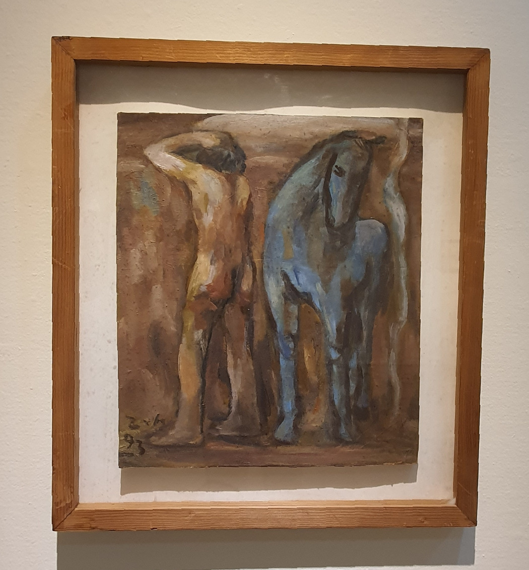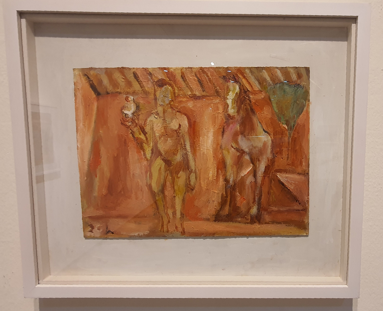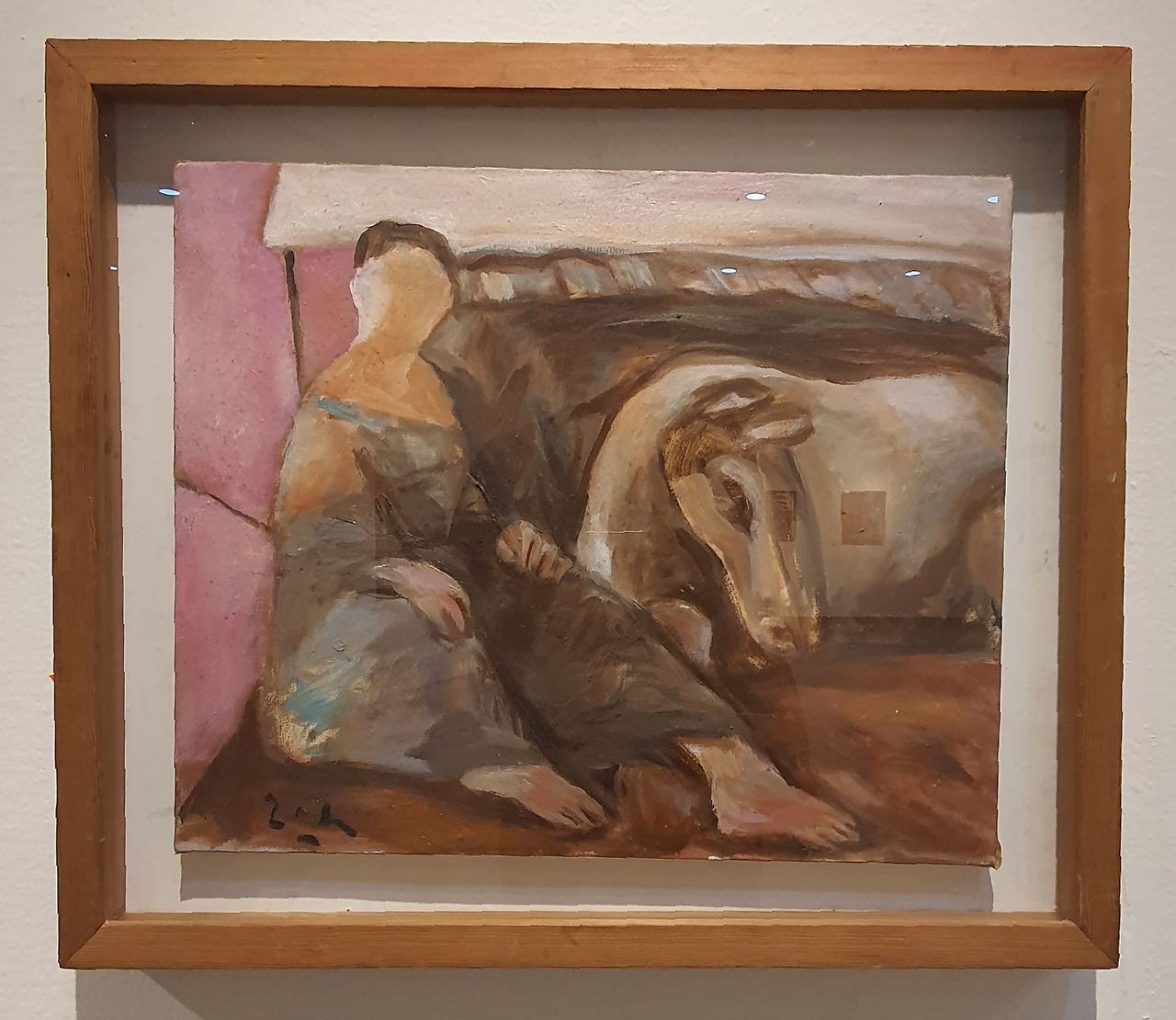 그동안 말이 등장하는 공간은 모두 건물의 내부였다. 문 밖에 있기도 했지만 문의 바깥일뿐 실내의 공간이 주가 되는 구도였기에 벽이 없는 공간에서의 말은 제시되지 않았다. 이 작품에서 말은 어느 해변에 있다. 말에게도 남자에게도 움직임은 보이지만 발의 형상이 분명하지 않다. -다른 작품들에서는 발이 분명한 형태로 제시된다. 땅을 굳게 딛고 서 있는 모양이다- 하늘과 바다와 백사장의 경계가 분명하지 않다. 그러나 혹은 그래서 자유로워 보이는 두 주체, 그동안 이 둘이 각각 분명하게 구분되어 있었다면 이번 작품에서 둘은 서로 떨어져 있는 다른 형태이기는 하나 그 정신적 영역은 이미 하나가 된 것으로 보인다. 벽이 등장하지 않음으로써 어디든지 갈 수 있는 여유가 부여되기도 했다.