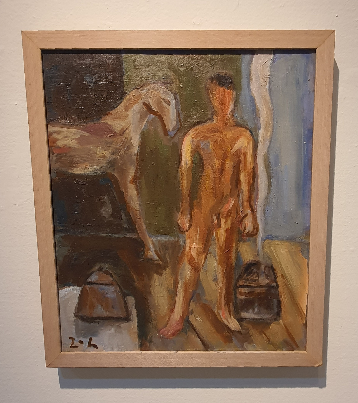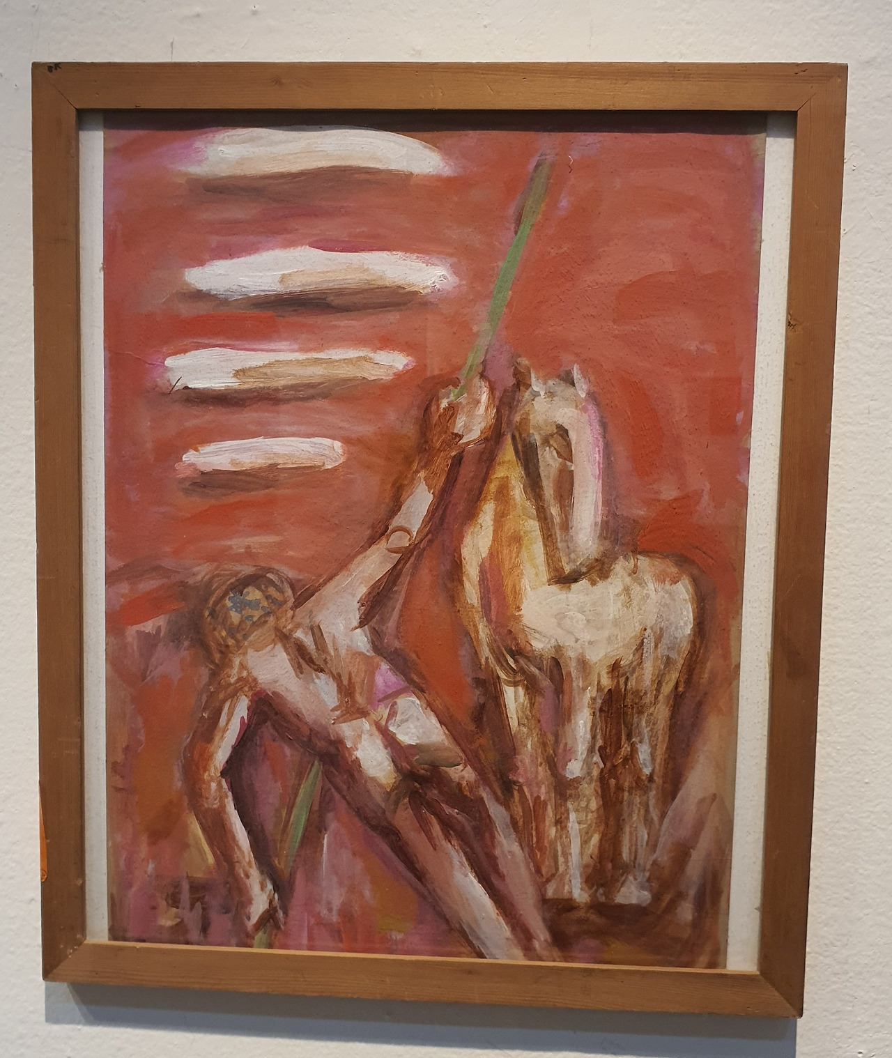 벽과 천장이 있는 붉은 공간이다. 말과 인물은 그 공간을 가득 채워버렸다. 공간이 모두 담을 수 없는 허용치를 벗어난 느낌이다. 문도 창문도 보이지 않는 절망 속에서 인물의 오른손에 새 한 마리가 앉아있다. 이제 자유로울 때가 되지 않았을까? 자유를 혀용 하거나 허용받아도 될 만한 순간이 왔다. 인물의 성별은 분명치 않으나 몸의 실루엣이나 다리의 모양을 보았을 때 여성인 듯하다. 벗어날 의지가 없는 갇힌 공간에 찾아온 한 여성, 새의 자유를 알려주며 유혹하고 있으나 이 유혹이라는 것은 단지 에로시즘적인 의미만을 표현하는 것은 아니다. 작품이 창작된 년도가궁금하다.