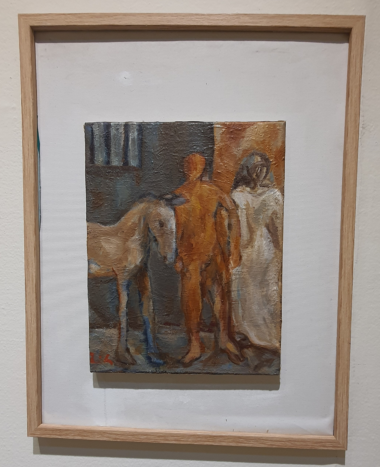 말이 들어왔다. 여전히 공간의 안쪽에는 시계가 있고 세 시를 가리킨다. 새벽 세 시 일 수도 있겠으나 하늘의 푸른 빛이 언뜻 보인다. 말이 등장하는 다른 작품들에 비해서 역동적인 선이 돋보인다. 긴 머리의 여성은 속이 비칠 듯 얇은 실크를 걸치고 말을 향하고 있으며 말은 고개를 돌리고 뒷걸음질 치는 형상이다. 공간으로 받아들이기는 했으나 아직 준비되지는 않은 상태로 보인다. 그러나 말은 고개만 돌렸을 뿐 몸은 돌리지 않은 모습이다.