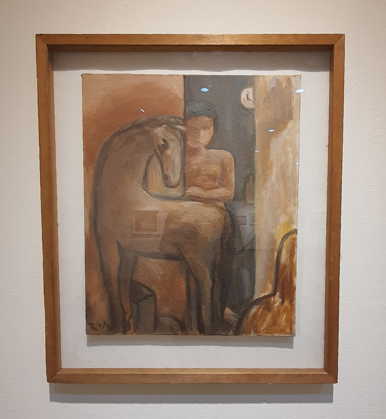 남자가 있는 공간의 안쪽에 시계가 등장한다. 문을 사이에 두고 문 안에 남자가 서 있으며 문 바로 앞에 말이 있다. 그리고 말보다 더 바깥쪽에서 화폭을 등진 채 문 안의 남자를 바라보고 있는 여자의 뒷모습이 보인다. 상자도 문 바로 앞에 놓여있다. 문을 열고 있는 순간이 아니라 문을 연 채 정지되어 있는 어느 시점의 표현이다. 문을 연 채, 문에서 손을 떼지 않은 채, 문을 더 열 지 다시 닫을지 아직 결정하지 못한 남자가 내부에 서서 바깥을 바라보고 있다. 말 역시도 문 바깥에 서서 이쪽을 향해 선 여자를 바라보고 있다. 남자의 시선과 말의 시선이 모두 여자에 머무른다. 제목은 <문 밖의 말>이지만 저 그림의 주인공은 여자다. 여자의 등장으로 인한 긴장이 느껴지는 작품이다.