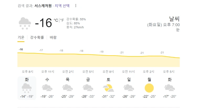 ※2024년 1월 8일 주 밴쿠버 주간 예보 출처: Weather.com그렇다면 요즘 캐나다 영주권 따기가 상대적으로 용이한 지역으로 유명한 중부의 사스카추안주(Saskatchewan)의 금주 날씨는 어떨까?