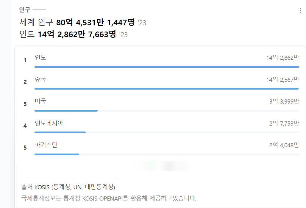 인도는 인구 14억의 강대국이다. 2023년 5월 기준 인도의 인구는 약 14억 2,862만 명으로 중국의 14억 2,567만의 인구보다 조금 더 많은 전 세계 인구수 순위 1위의 나라이다.