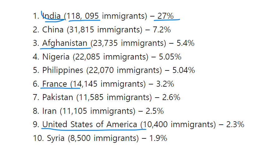많은 사람들이 해외 이주 시 선호하는 영어권 국가 중 캐나다는 다양한 이민 프로그램 정책 덕분에 다른 영어권 국가에 비해 상대적으로 이민이 쉬운 편이긴 하다.(단 상대적으로 쉽다는 것이지 영주권 획득 과정은 사실 그리 쉽지는 않다 ^^) 2022년 캐나다 영주권 취득 국가별 순위 통계자료가 나와 살펴보니 역시나 인도계가 압도적이다. 흥미로운 점은 생각보다 영주권 취득자 중 인도계와 중국계 숫자가 차이가 많이 나는 점과 아프가니스탄 난민들을 많이 받아들인 점 그리고 나이지리아, 프랑스, 미국인들이 10위 안에 들어있는 것도 특이한 점이다.