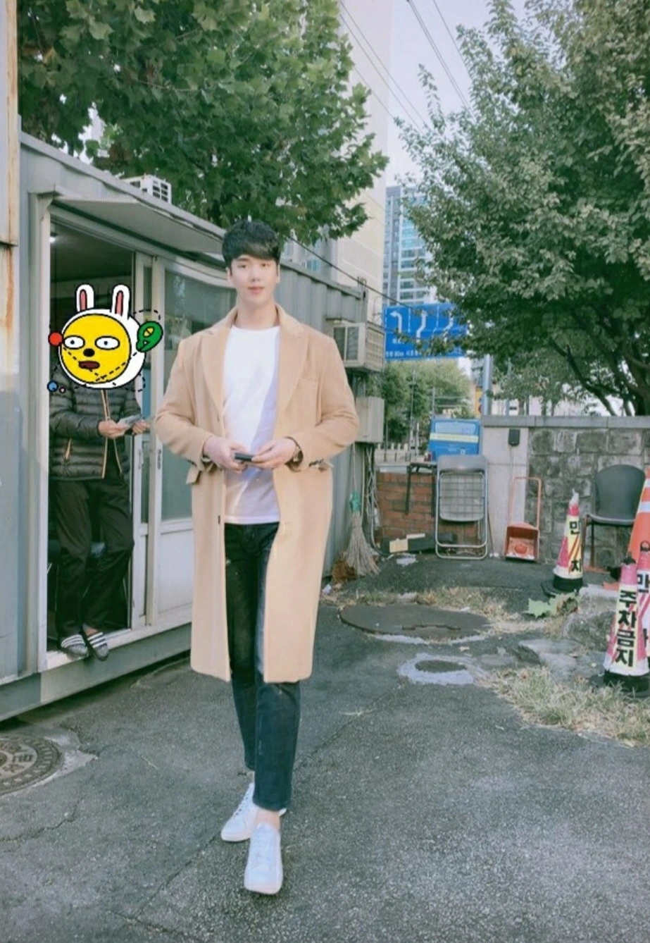 차를 기다리는 동안 베란다 쪽으로 가서 밖을 쳐다보며 생각에 잠긴다.