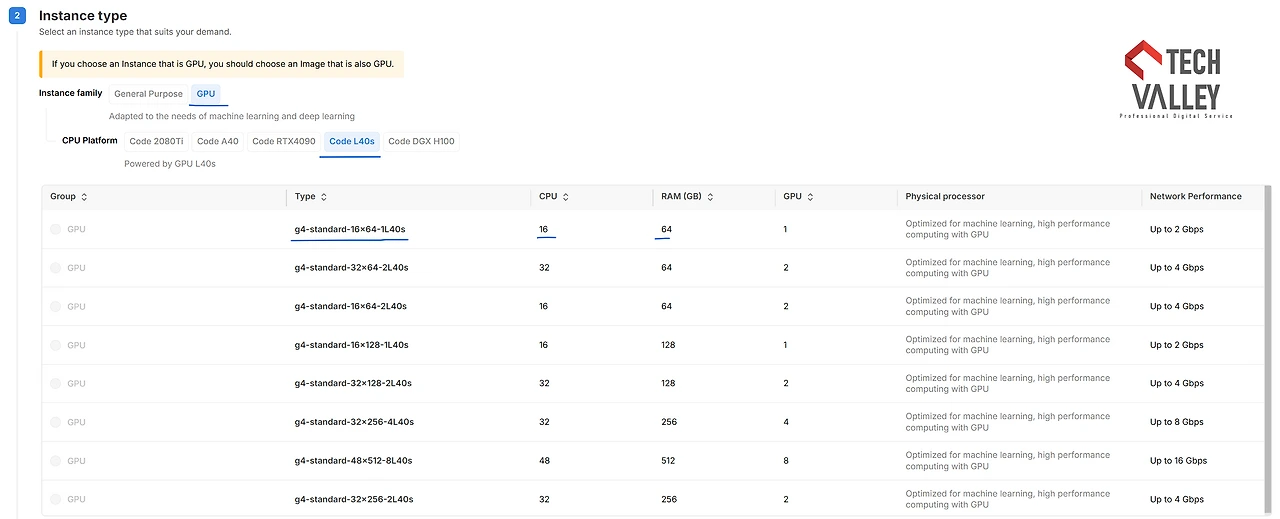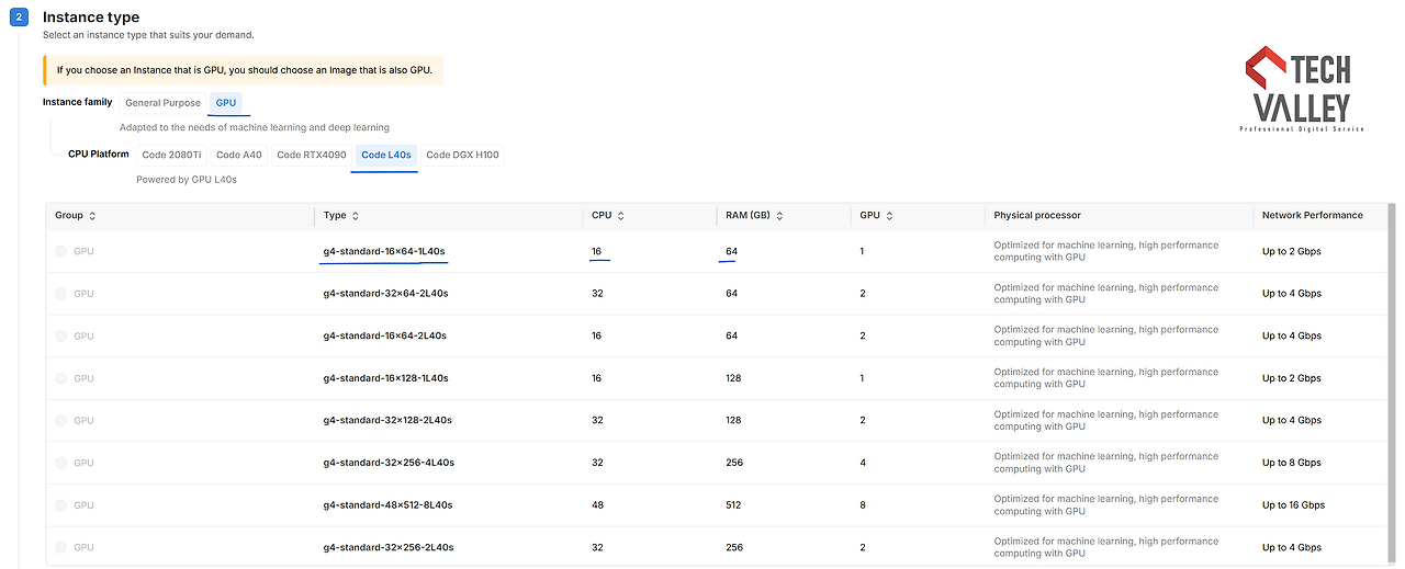 TechValley에서는 아래와 같이 Nvidia L40S GPU가 탑재된 아래와 같이 다양한 VM (Virtual Machine)을 준비하고 있습니다.