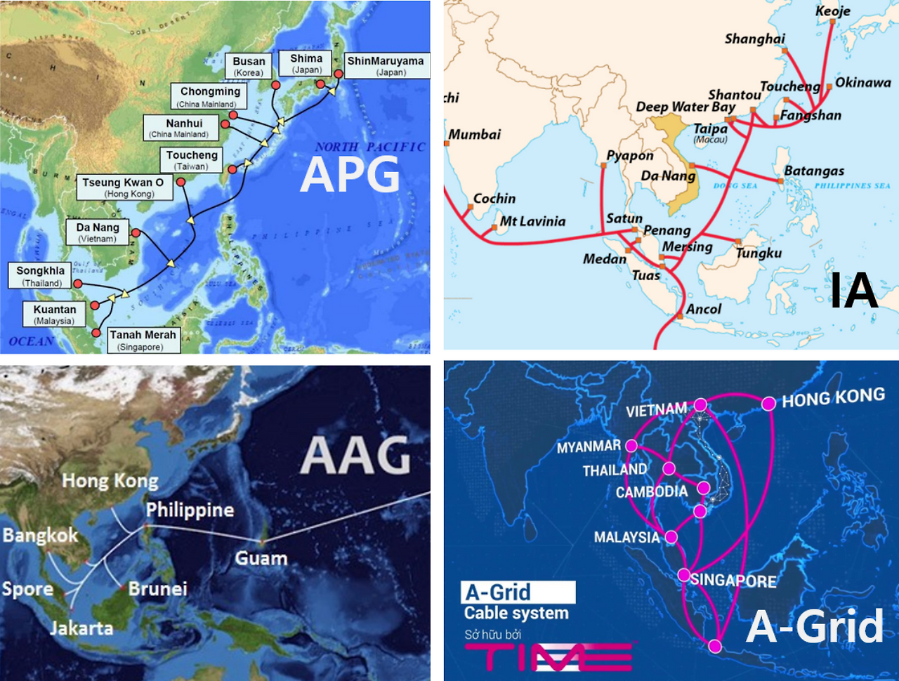 해외 연결망은 아래 그림과 같이 총 4개로 아시아 해저 통신 백본망인 APG, IA, AAG, A-GRID로 연결되어 있습니다. (베트남 통신사들은 이 백본방을 직접 소유하고 있는 게 아니라 백본망까지 연결을 하는 브리지 역할을 제공합니다.)