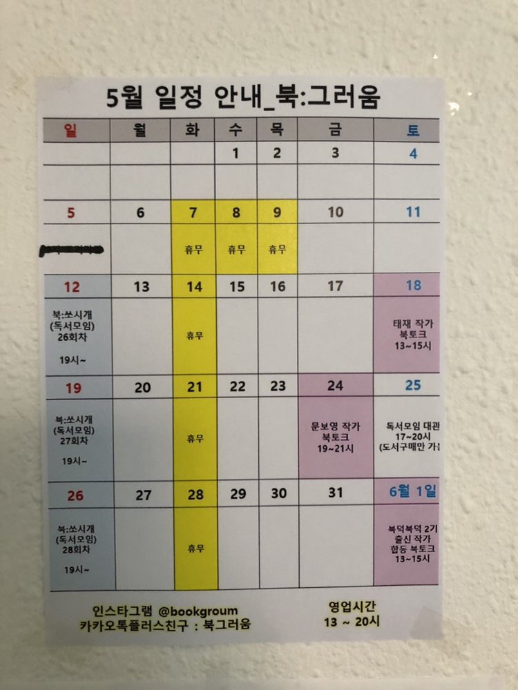 서점은 건물 2층에 자리 잡고 있었는데, 계단 켜켜이 벽에 붙여진 포스터가 시선을 사로잡았다. 5월 일정을 안내 포스터는 주 1회 휴무,