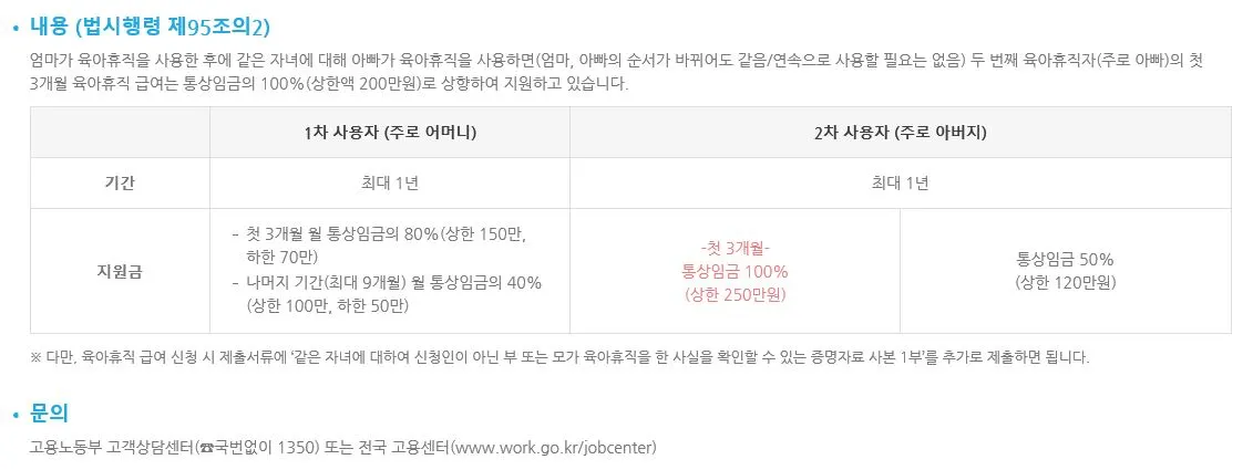 (엄마가 쓴 다음 아빠가 육아휴직을 사용하고, 기간은 1년, 월급은 250만원 이상인 경우)