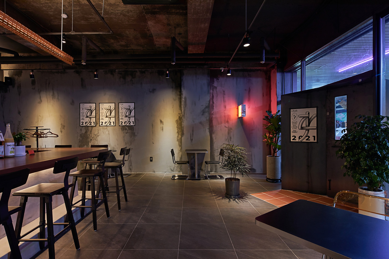 *수평 반듯한 정문을 기울게 틀었다. 손님이 맨 처음 가게를 방문했을 때 눈과 손이 닿는 곳이기에 착각의 정체성을 가장 명료하게 보여주고 싶었다. 간판도 외부가 아니라 내부에 달았고 양쪽 벽을 다르게 디자인했다.