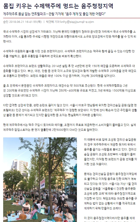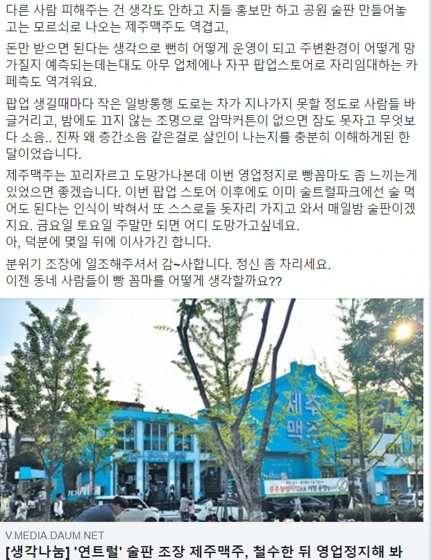 우선 피크닉 세트는 연남동 공원을 술판으로 만들어버렸다. 다수의 시민들이 쉬기 위해서 만들어 놓은 공공시설을 사기업의 영업장으로, 그것도 술을 마시는 공간으로 만든 것은 바람직하지 않다. 그곳은 미성년자도 쉴 수 있어야 하는 곳이다. 그리고 주변에 거주하는 주민들이 편안히 쉬어야 할 권리도 있다. 하지만 제주맥주의 팝업스토어 때문에 몰려든 사람들로 인해서 공원은 쓰레기와 고성방가 그리고 취객들로 넘쳐났다. 그로 인해서 무엇보다 주변 상인들과 주민들이 큰 피해를 받았다는 것은 명백한 사실일 것이다. 그리고 크게 보면, 이런 사건을 조장했다는 제주맥주의 브랜드도 좋은 이미지를 갖지 못하게 했다. 야외에서 맥주를 퍼 마시며 취하는 문화가 제주도의 이미지는 아니지 않은가? 제주도의 청량함과 편안함을 주고 싶다는 제주맥주의 가치와 너무나 상반되는 행위를 조장했다는데 이의가 없을 것 같다. 이번 사건으로 제주맥주 팝업스토어의 원래 영업장이었던 카페는 마포구로부터 불법 영업으로 영업정지 조치를 받았다. 제주맥주의 영업 방식이 불법이라는 결론이었다. 때문에 뉴스에도 오르내리고 적지 않게 부정적인 이미지를 얻었다.