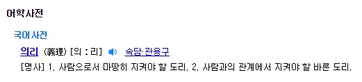 의리의 사전적 의미는 사람의 관계에서 마땅히 지켜야 할 도리라고 명시돼있다. 사전적 의미만 봐도 우리가 평소에 생각하는 의리의 의미보다 무게감이 있음을 알 수 있다. 그리고 '사람의 관계'라는 것은 어떤 특정 관계가 아닌 모든 관계인 것이다. 그렇기에 친구 관계는 물론이고 가족 관계, 부부 관계에서도 의리를 지켜야 한다.