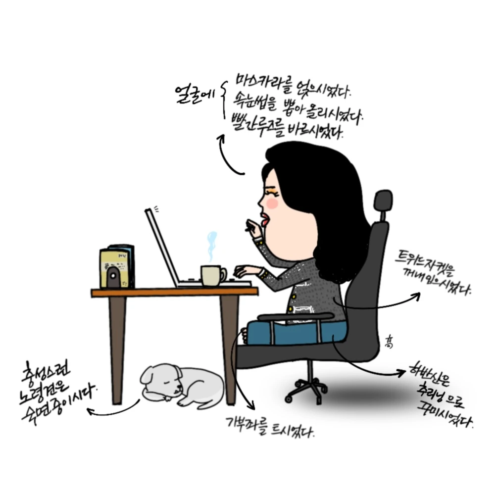 책상에 앉아 노트북에 내장돼 있는 카메라를 보며 밝은 표정을 지어보이는 그녀, 얼굴 근육을 이리저리 풀고 있다. 아내는 의자에 앉을 때도 가부좌를 틀고 잘 앉는데 역시 이번에도 마찬가지다. 그게 편하다니 그러려니 한다. 무튼 이색적이다. 헤어 드라이어의 뜨거운 바람을 한껏 받아 안은 헤어에 공들여 한 메이크업. 단정한 정장 상의를 차려 입고 하의는 잠옷바람. 가부좌를 틀고 앉은 그녀 밑에는 충성스런 노령견 쪼매니가 잠들어 있다.