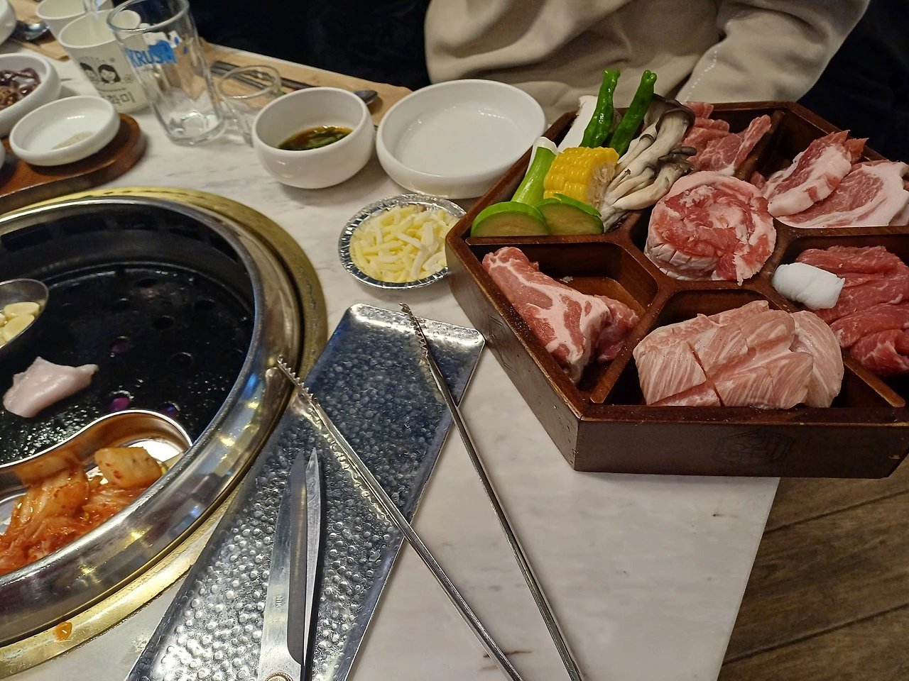 집에 돌아온 뒤 아이들은 할아버지와 함께 티브이 보고 놀라 하고 저와 베짱이씨는 친구들을 만나러 갑니다. 일차로 고깃집에 가서 고기를 구워 먹습니다. 입에서 살살 녹습니다. 고기의 콸리티가 아주 좋군요. 게다가 무한리필 쌈과 샐러드바도 최고입니다.