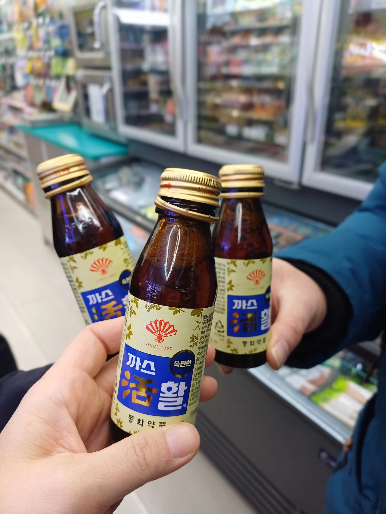 3차를 가기 위해 가스활명수를 마십니다. 3차는 양꼬치집입니다. 한국에 와서 살기 위해 가스 활명수를 마십니다. 왜냐하면 제 지인들에게는 저를 보는 것이 저를 만나는 마지막 날이지만, 저희는 그 마지막날을 2주간 계속해야 하기 때문에 살려면 활명수는 필수입니다.