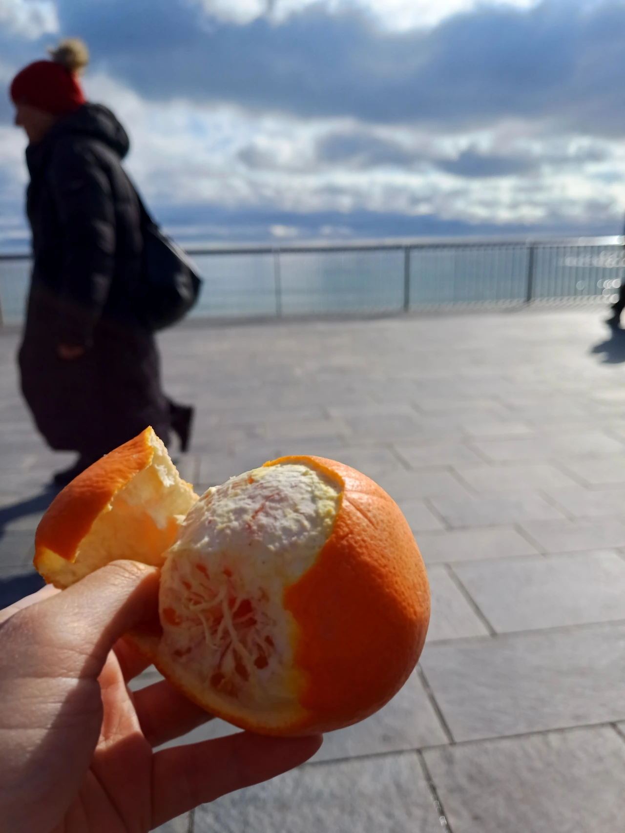 벤치에 앉아 귤과 오렌지를 까먹는다. 달고 시원하고 맛있다.