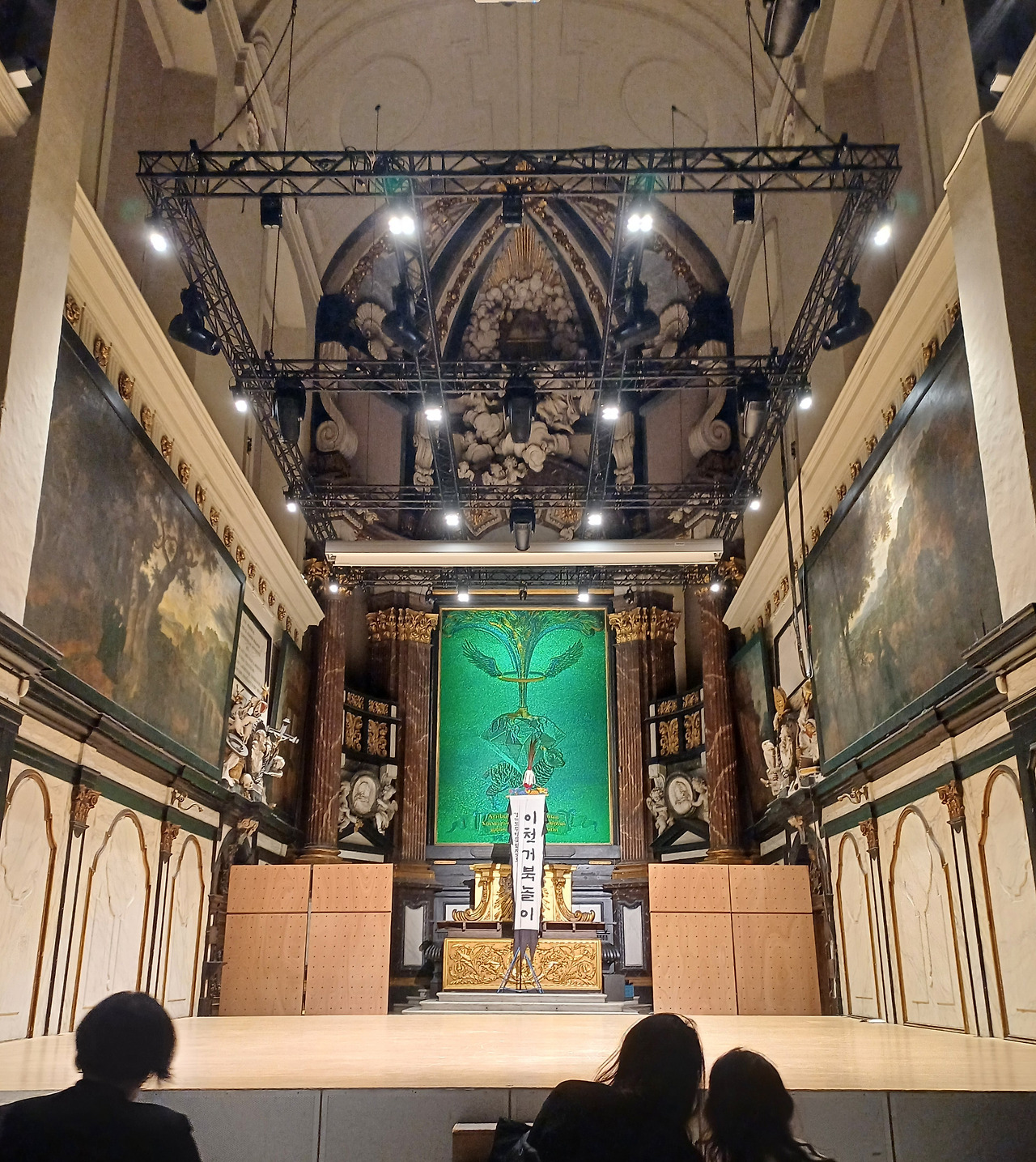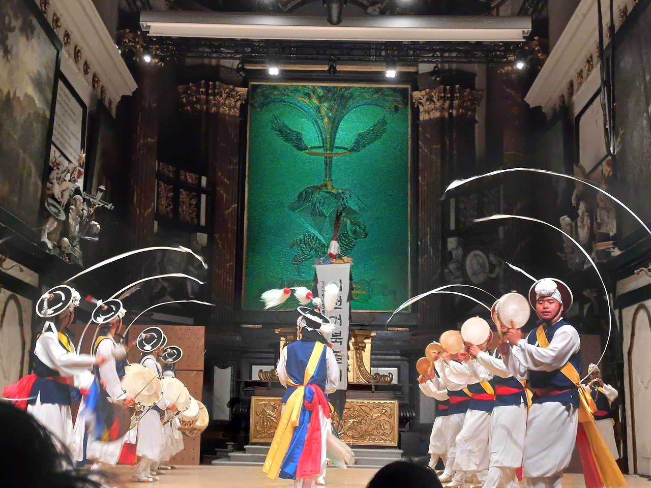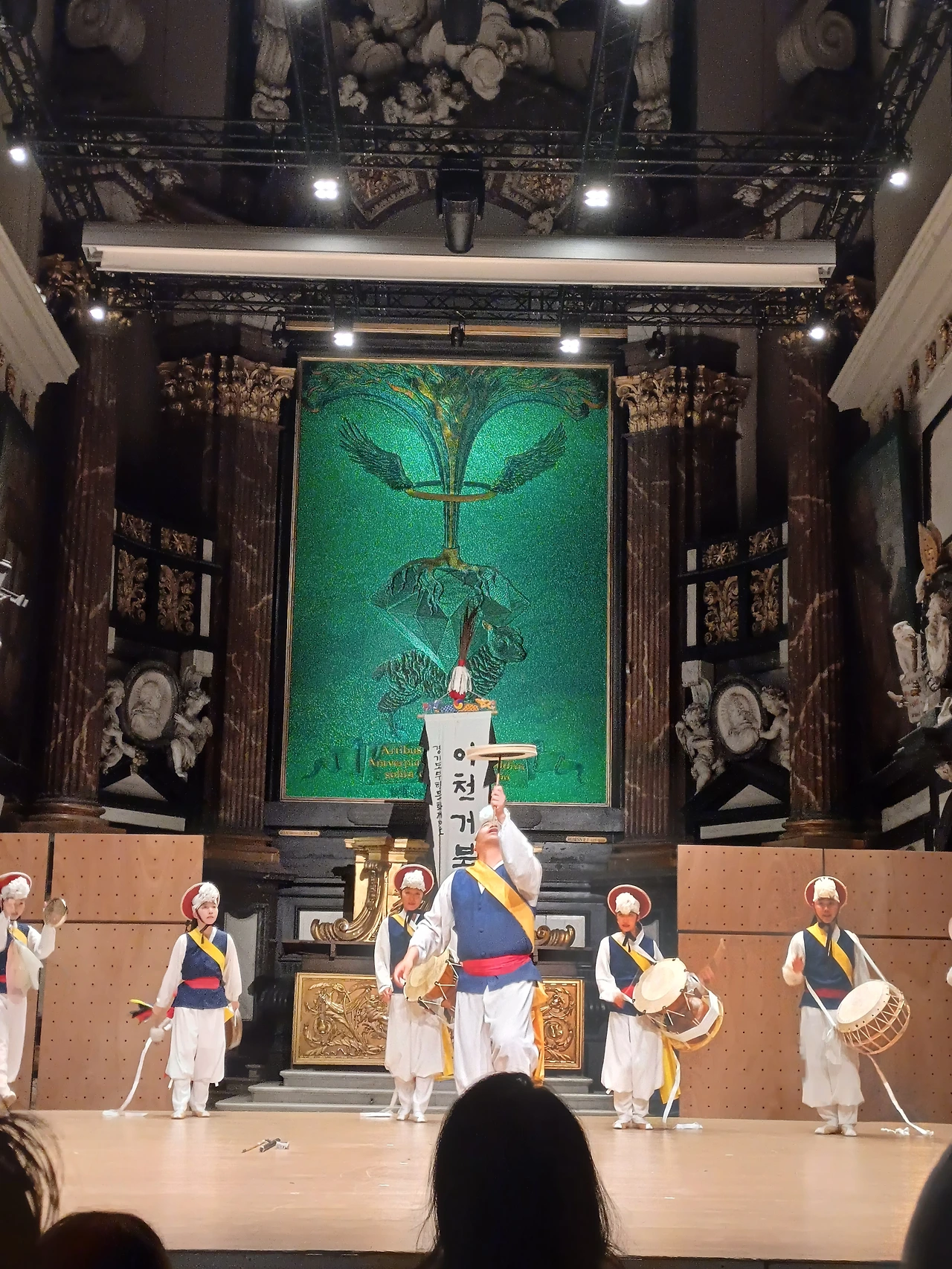 공연을 관람하며 아쉬운 점도 몇 가지가 있었습니다. 먼저 공연장에 관한 것인데요, 저는 이 공연 이외에도 본 공연장을 가끔 찾아 콘서트를 관람하곤 했습니다. 주로 클래식 채임버뮤직이었고, 플룻, 호른, 바이올린과 같은 악기가 연주되는 대리석으로 둘러싸인 한때는 교회였지만 지금은 공연장으로 쓰이는 곳이지요. 이 공연장은 클래식 채임버뮤직 위주로 쓰이고 대리석 벽 때문에 소리가 큰 인스트러멘탈 음악에는 적합하지 않은 장소라고 개인적으로 생각합니다. 무대도 움직임이 큰 사물놀이에는 너무 좁은 것이 아닌가 생각이 들었고요.