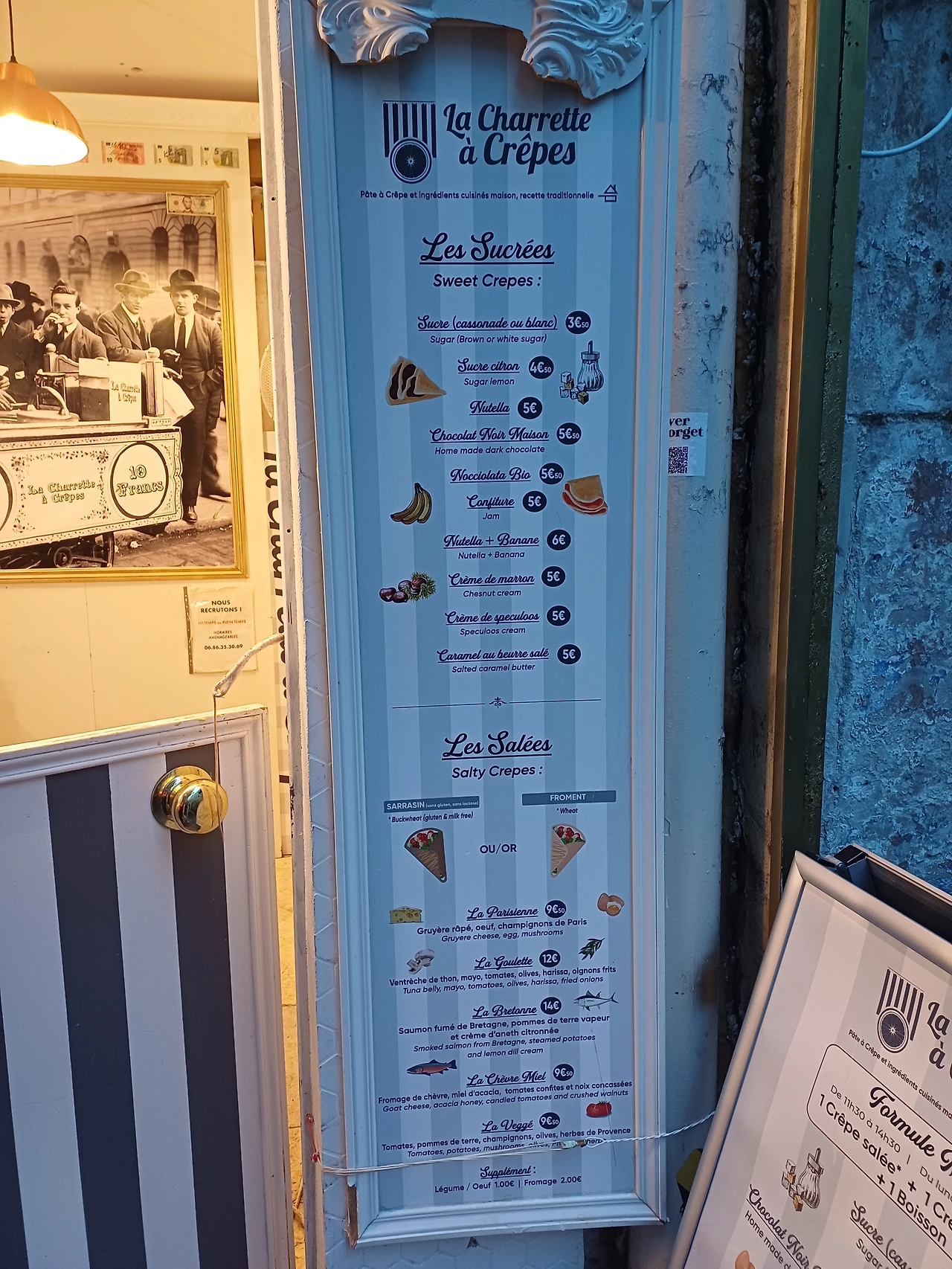 불쇼를 했던 크렙의 이름은 크렙 수제뜨 (Crêpe Suzette)이다. 메뉴에는 없지만 가격은 7.5유로. 혹시 불쇼보고 싶은 분들을 위해 적어본다.