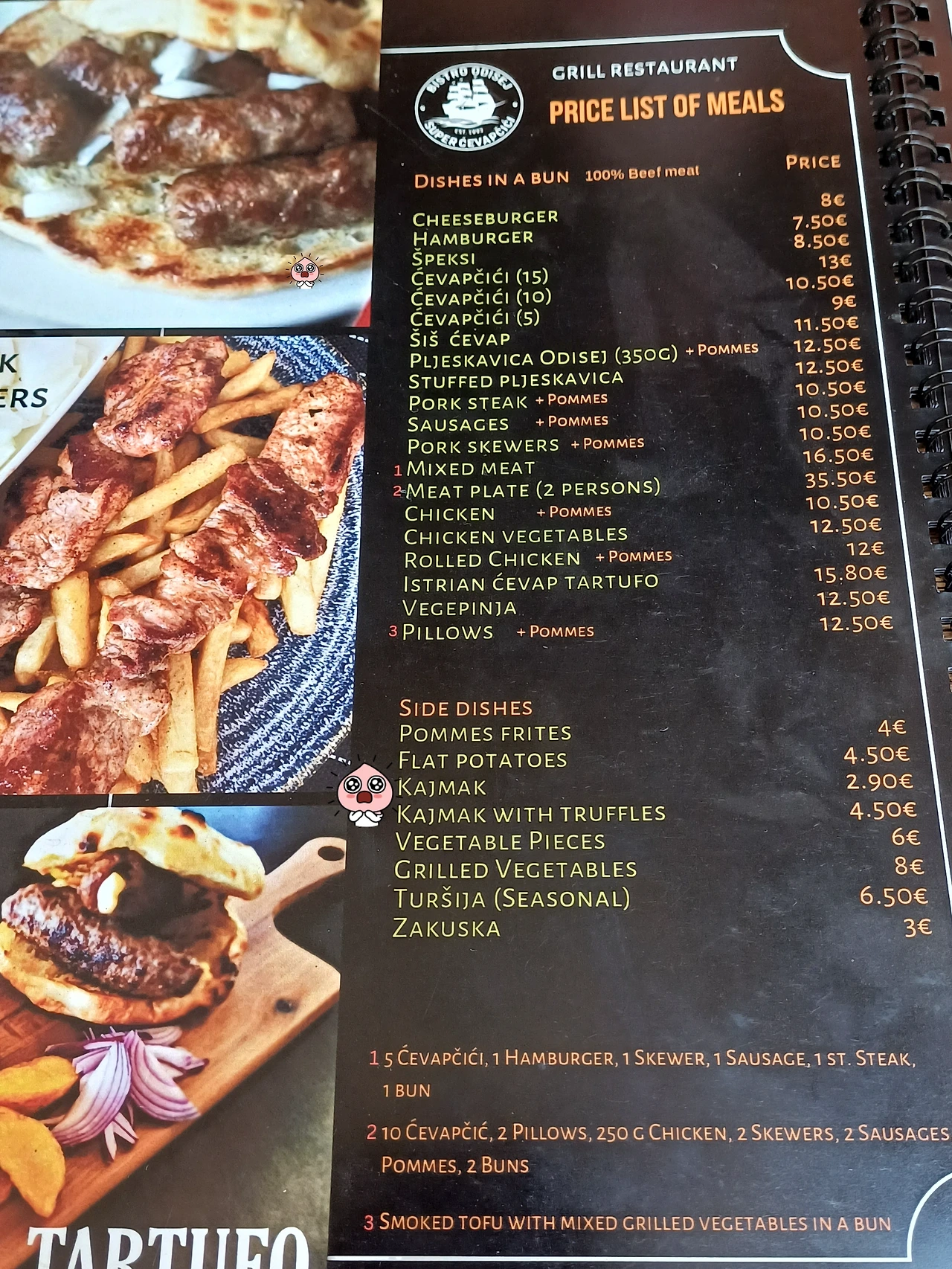 주차를 하고 골목을 딱 도는 순간, 앗, 이 냄새는? 그릴에 고기를 굽는 냄새가 아니던가? 냄새를 따라가 보니 그릴레스토랑이 있었다. 홀린 듯 안으로 들어가니 메뉴판을 가져다준다. 찬찬이 메뉴판을 살펴보는데.... 여기 크로아티아 맞아? 메뉴판을 잘 보시라. 시시 케밥과 카이막이 눈에 들어온다.